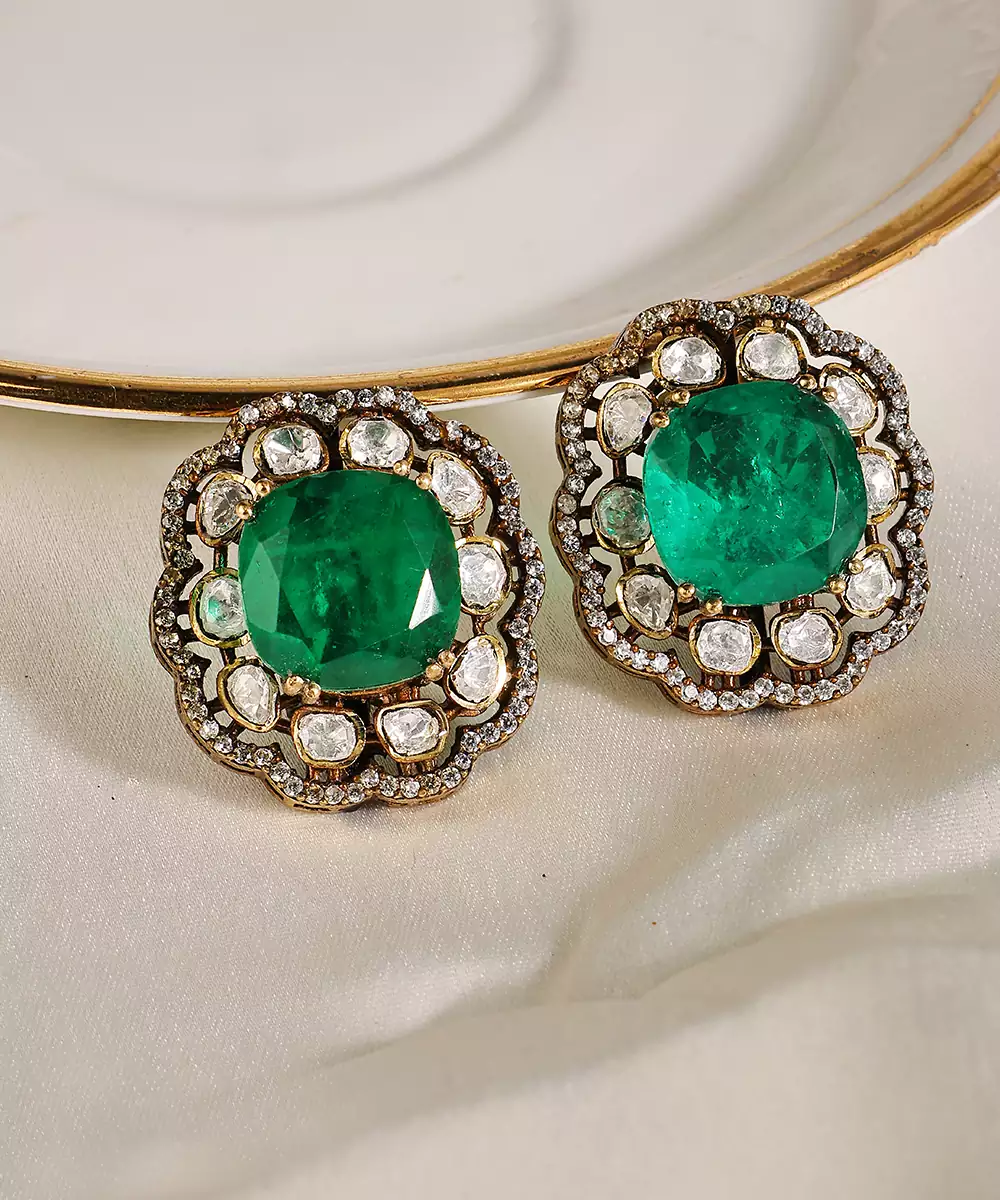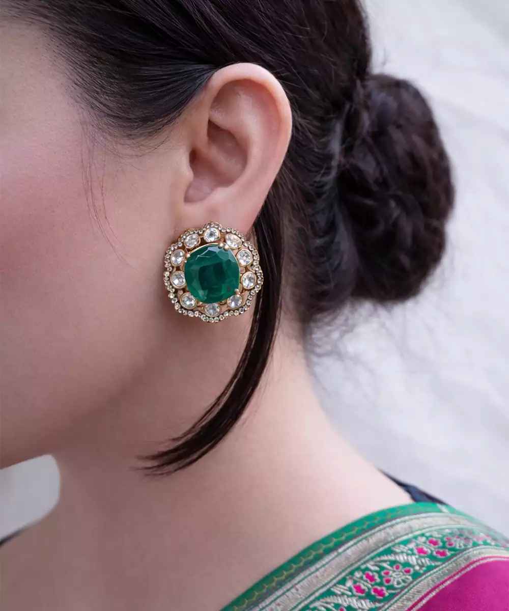 These Gold Plated Kundan Green Stones Stud Earrings Radiate Classic Elegance And Festive Charm. Featuring Intricate Kundan Craftsmanship Accented With Vibrant Green Stones, They Add A Refined Touch. Perfect For Weddings And Celebrations, They Beautifully Enhance Ethnic Ensembles With Timeless Sophistication.