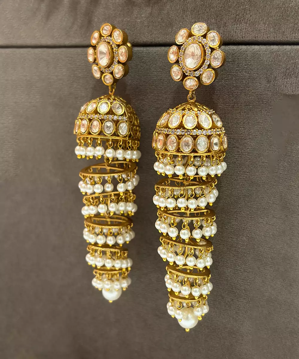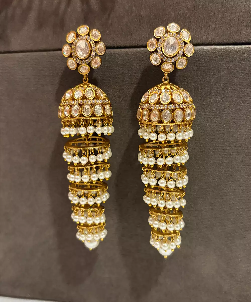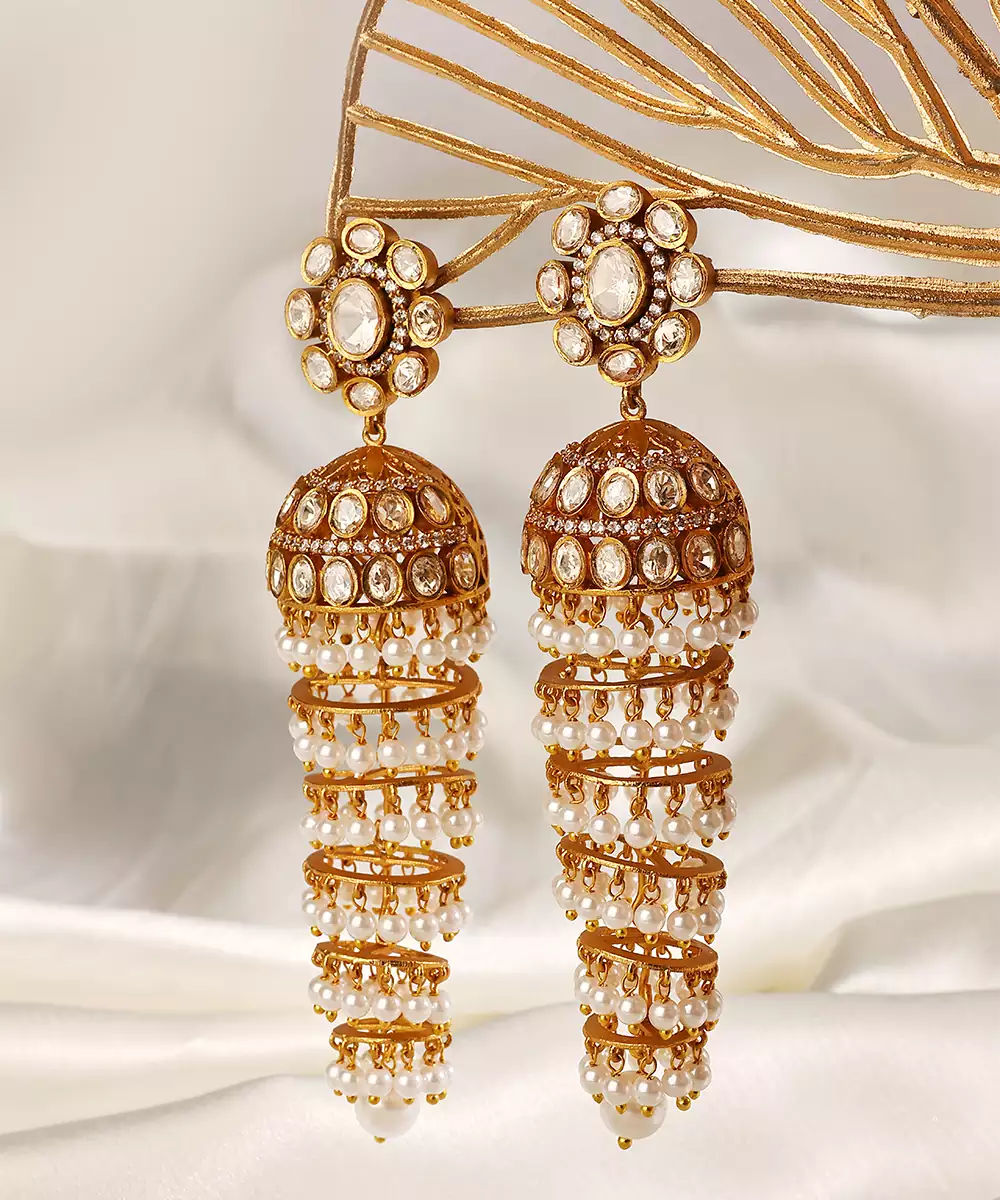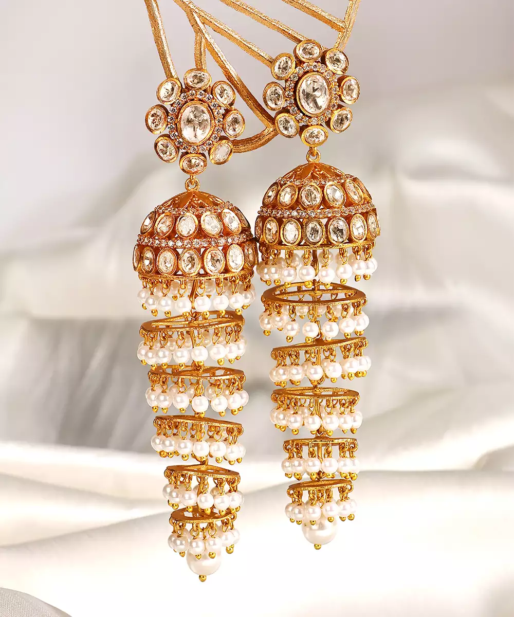 These Gold Plated Kundan Jhumka Earrings Exude Traditional Elegance And Royal Charm. Crafted With Intricate Kundan Detailing And A Radiant Gold Finish, They Offer Graceful Movement And A Festive Appeal. Perfect For Weddings And Celebrations, They Beautifully Enhance Ethnic Ensembles With Timeless Sophistication.