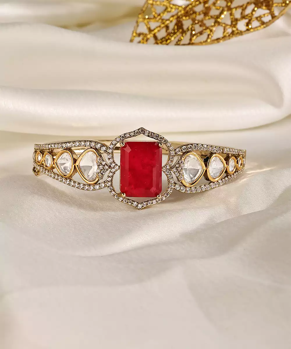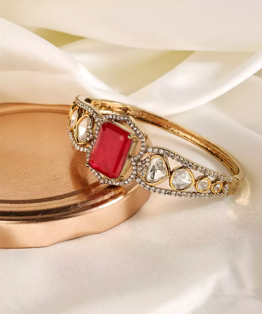 This Gold Plated Kundan Red Stone Bangle Exudes Regal Elegance And Festive Charm. Adorned With Vibrant Red Stones And Intricate Kundan Detailing, It Adds A Luxurious Touch To Any Ethnic Ensemble. Perfect For Weddings And Celebrations, It Enhances Traditional Outfits With Timeless Sophistication.