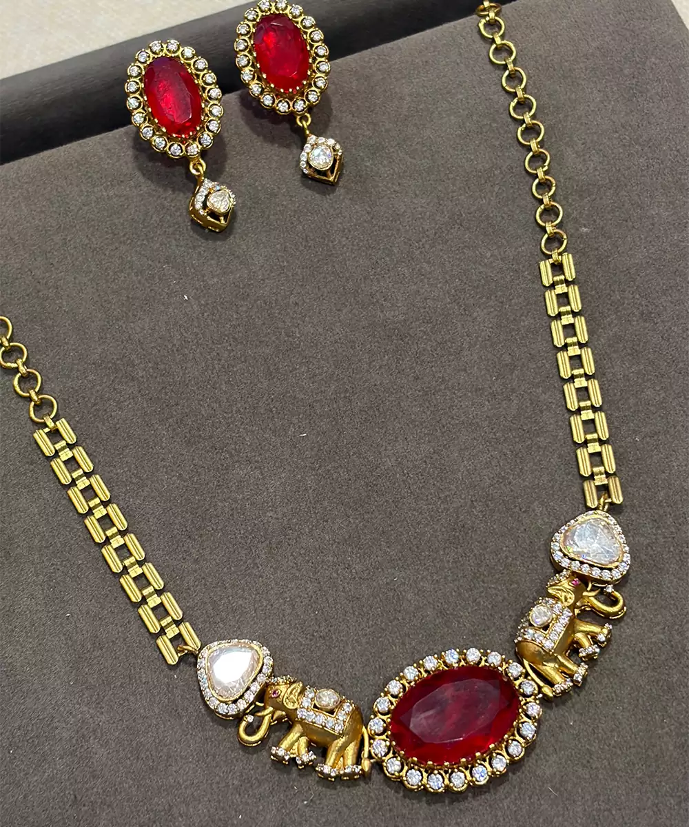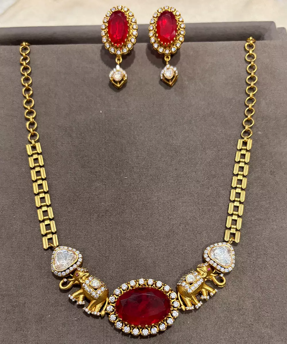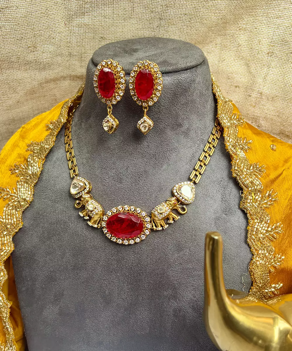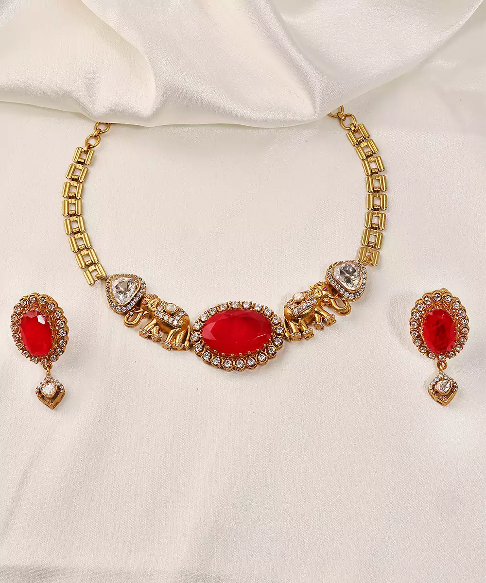 This Gold Plated Kundan Red Stones Necklace Set Exudes Regal Elegance And Festive Charm. Adorned With Rich Red Stones And Intricate Kundan Craftsmanship, It Adds A Luxurious Touch. Perfect For Weddings And Celebrations, It Enhances Ethnic Ensembles With Timeless Beauty And Refined Sophistication.