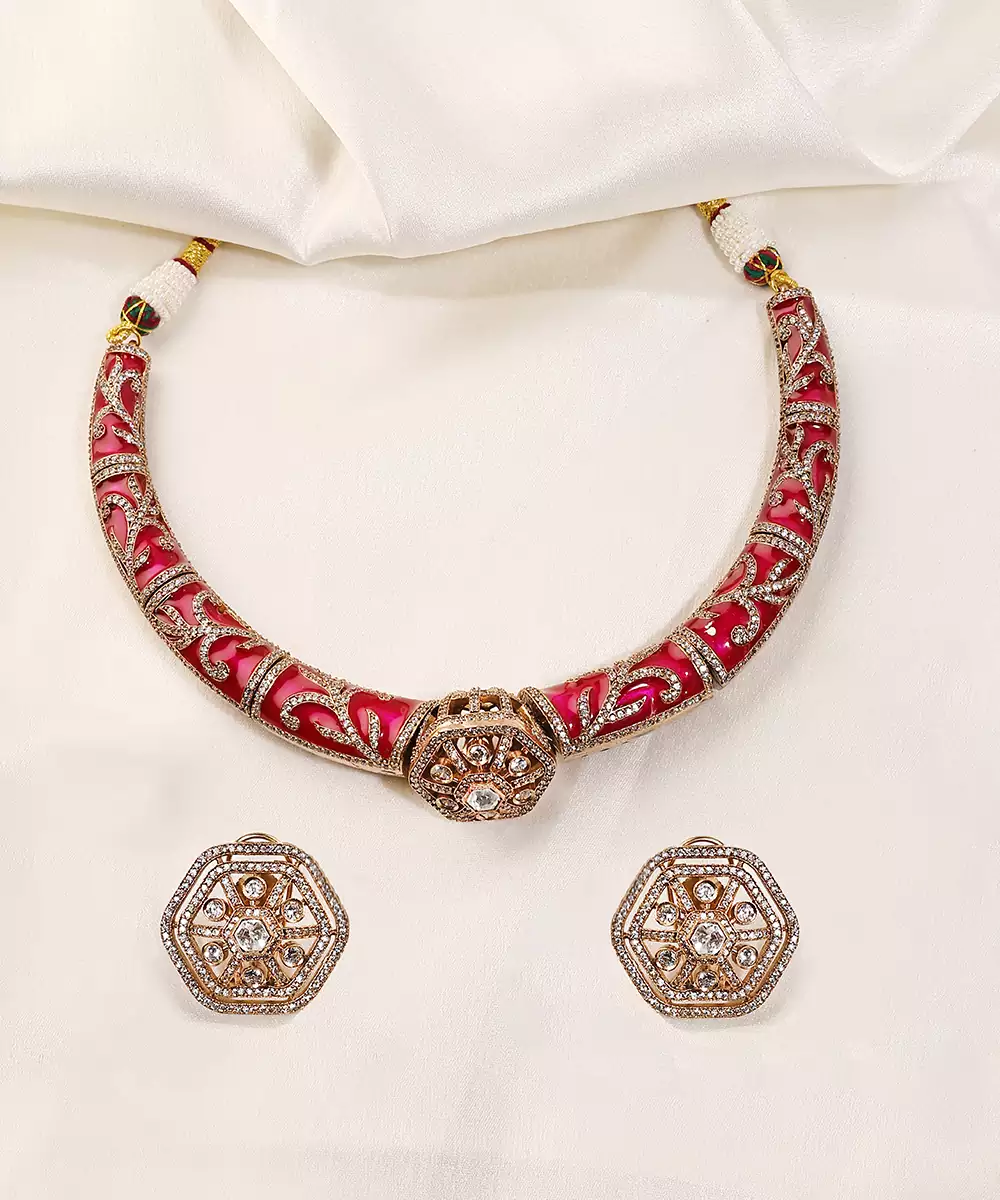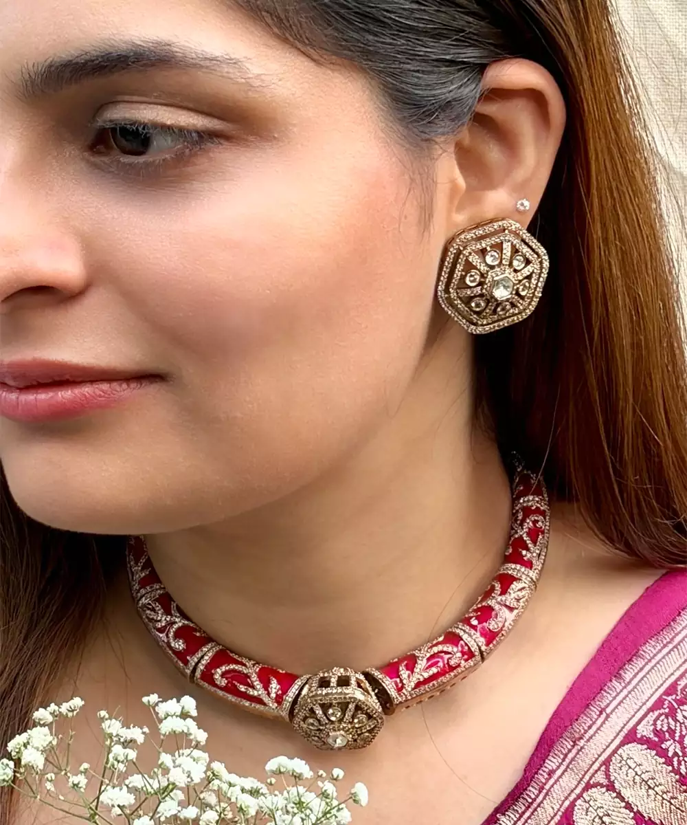 This Gold Plated Kundan Red Stones Necklace Set Exudes Regal Elegance And Festive Charm. Adorned With Rich Red Stones And Intricate Kundan Craftsmanship, It Adds A Luxurious Touch. Perfect For Weddings And Celebrations, It Enhances Ethnic Ensembles With Timeless Beauty And Refined Sophistication.