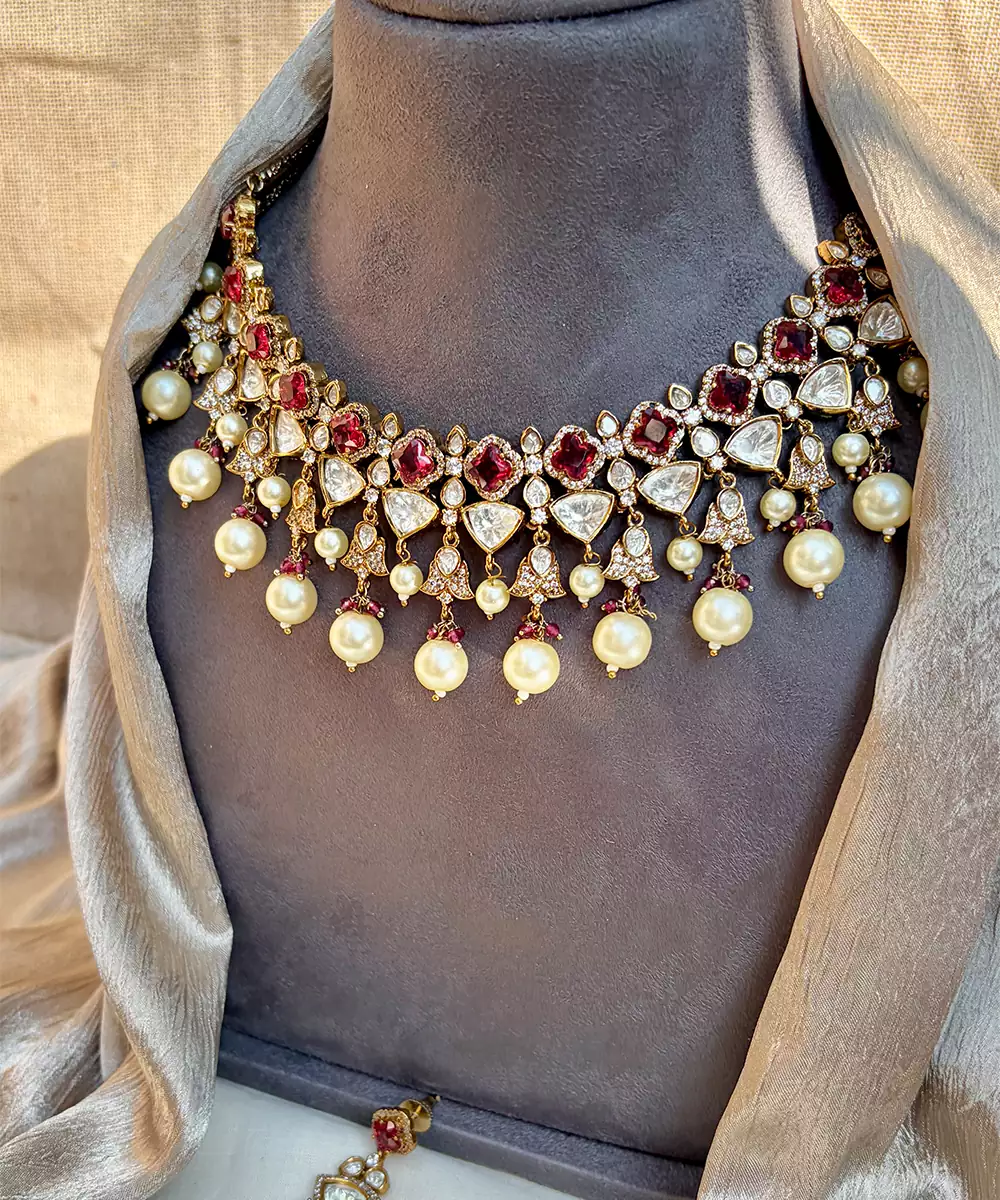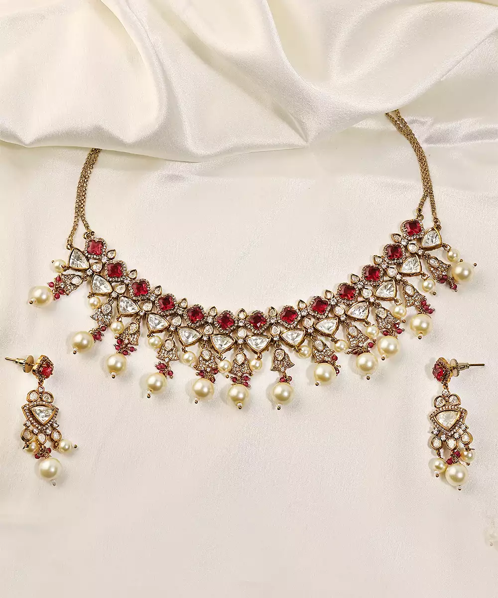 This Gold Plated Kundan Red Stones Necklace Set Exudes Regal Elegance And Festive Charm. Adorned With Rich Red Stones And Intricate Kundan Craftsmanship, It Adds A Luxurious Touch. Perfect For Weddings And Celebrations, It Enhances Ethnic Ensembles With Timeless Beauty And Refined Sophistication.