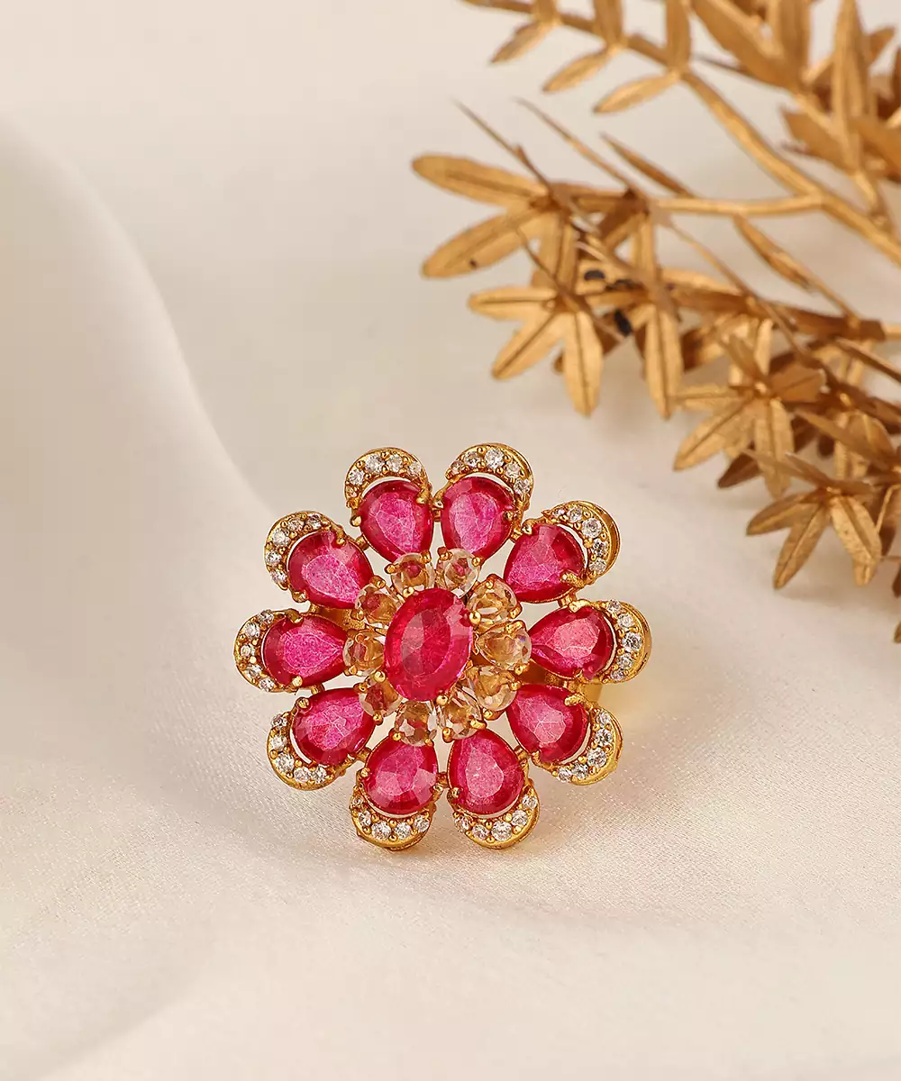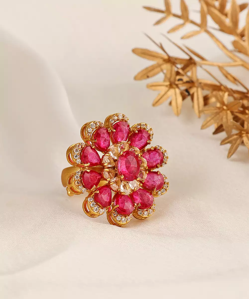 This Gold Plated Kundan Red Stones Ring Exudes Regal Elegance And Timeless Charm. Featuring Intricate Kundan Craftsmanship Accented With Vibrant Green Stones, It Adds A Luxurious Touch. Perfect For Weddings And Festive Occasions, It Enhances Ethnic Looks With Refined Beauty And Traditional Sophistication.