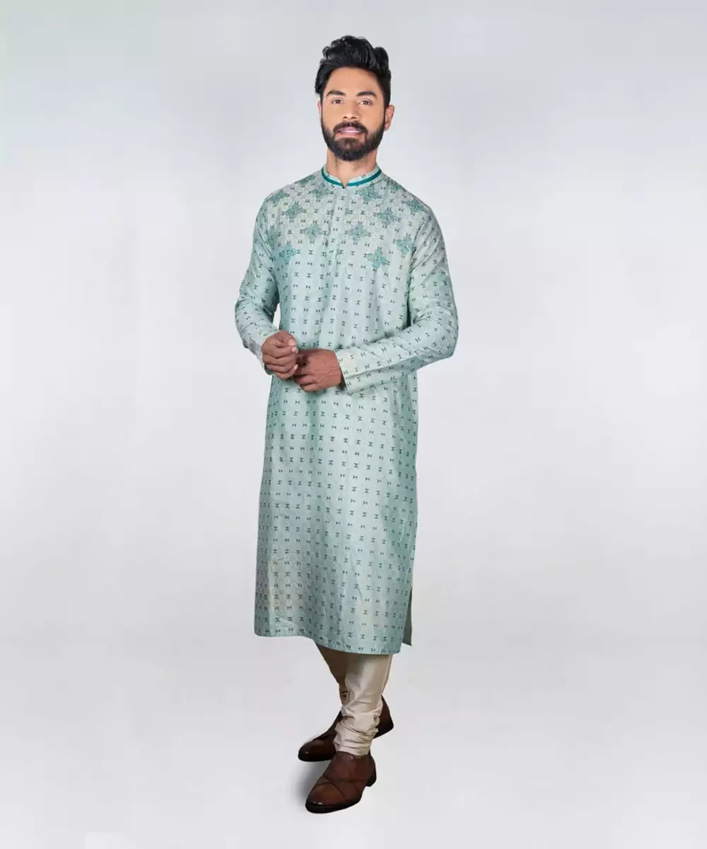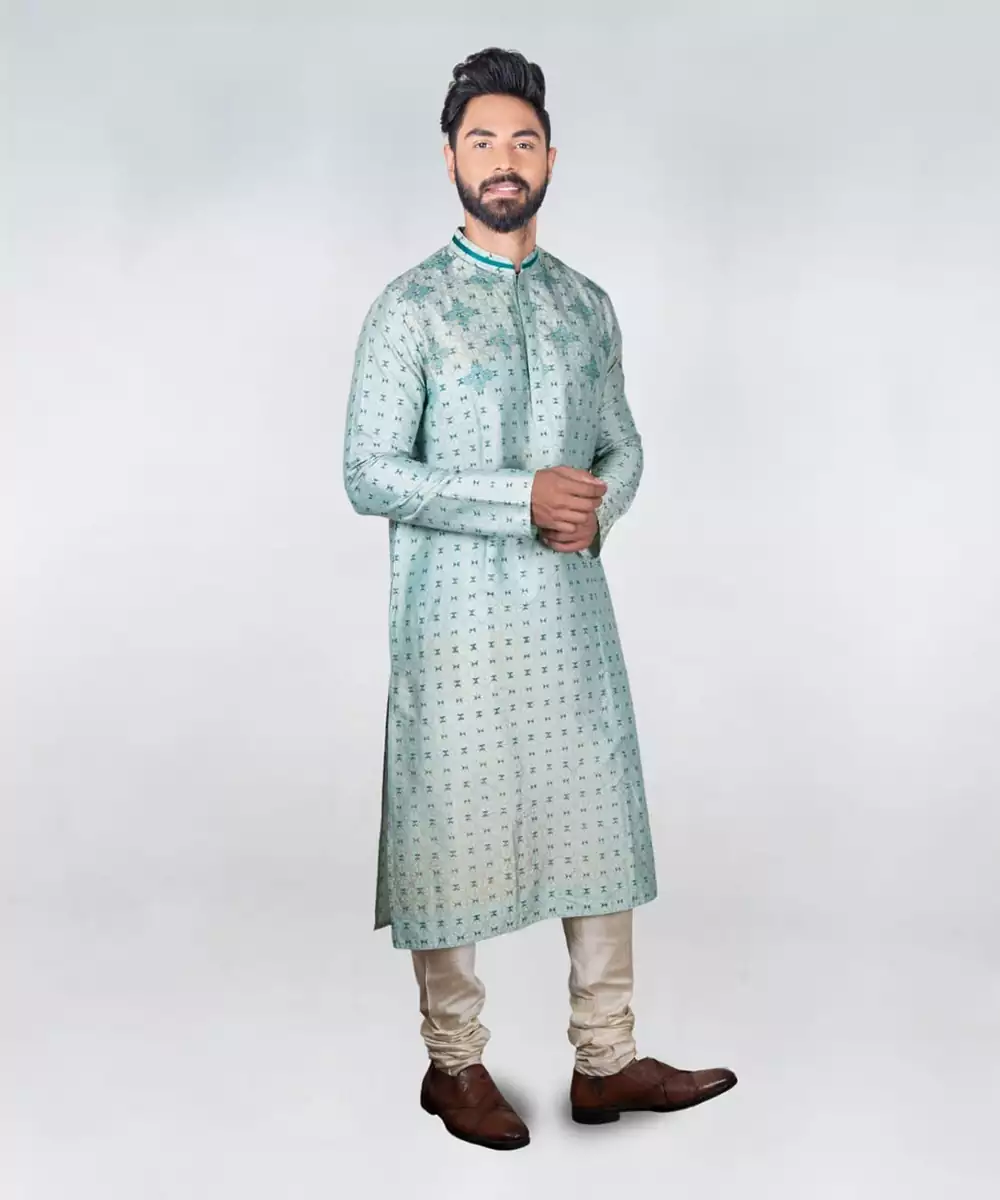 Aqua Green Printed Kurta With Embroidery Set