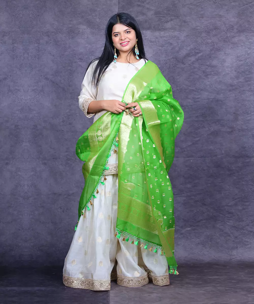 A Graceful Ivory Banarasi Sharara Set In Pure Chanderi Fabric That Combines Heritage With Elegance Paired With A Brilliant Green Organza Dupatta Perfectly Completes The Look. .