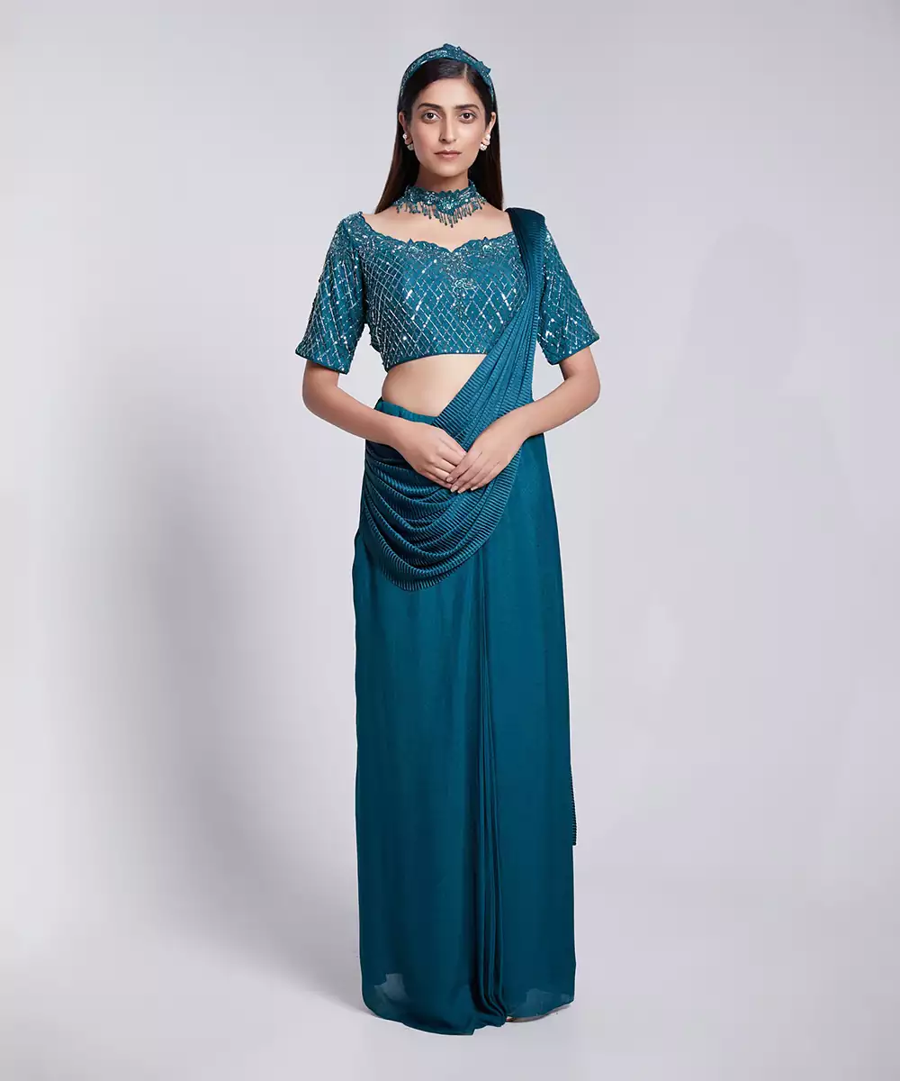 Beautifully Hand Crafted Blouse With Utmost Precision. Fabric: Crepe And Crush Satin Silk Color: Teal Green Care: Dry Clean Only