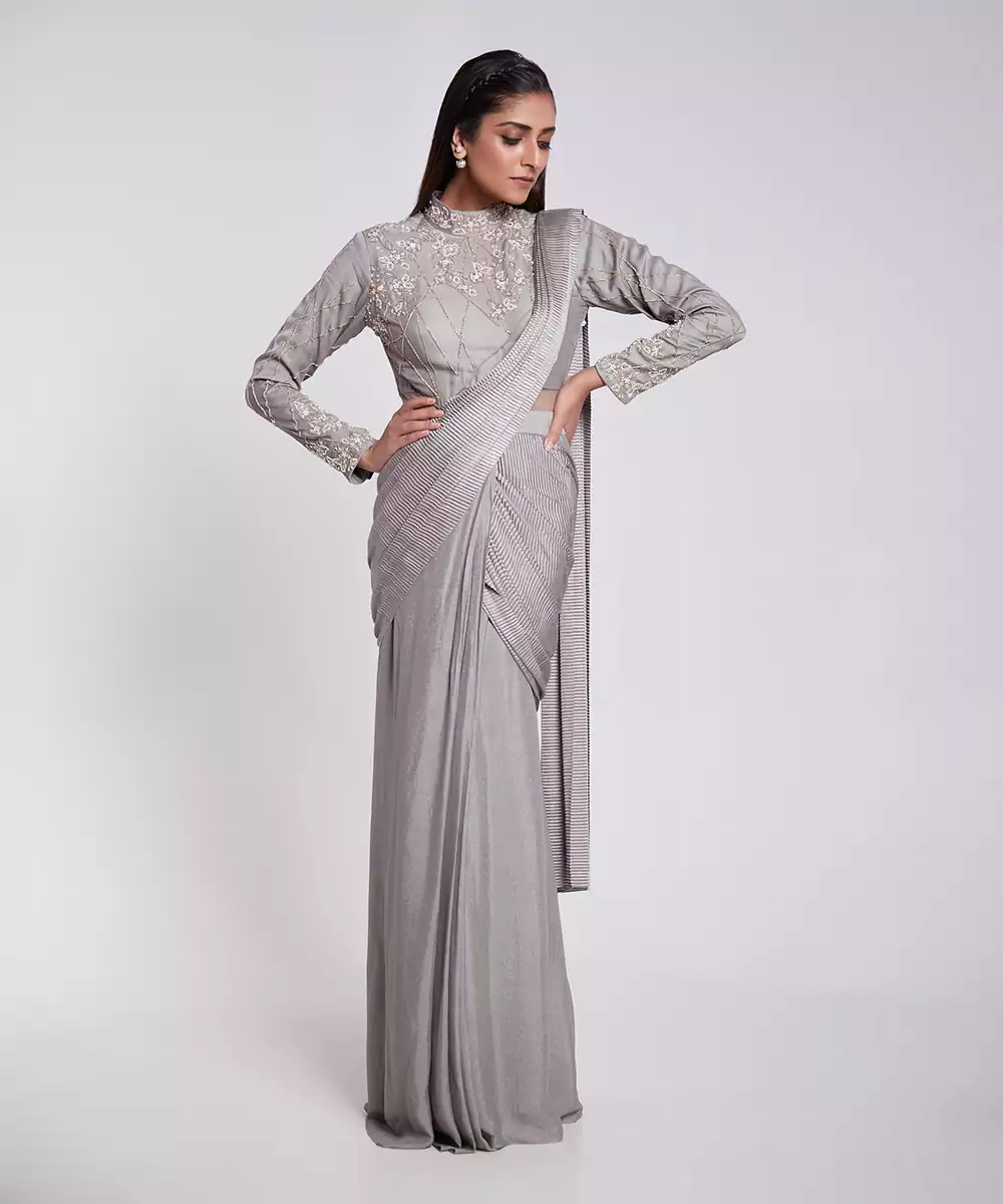 Gown Saree Foe The Lovely Ladies Who Want To Look Different And Elegant. Its A One Piece Dress Pre Draped Pallu. The Blouse Is Hand Embroidered With Beautiful Work Details. Fabric: Crepe And Crush Satin Silk