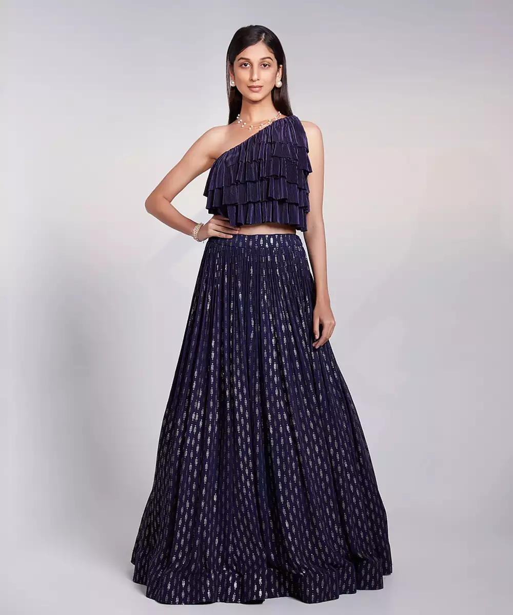 One Shoulder Crop Top With Pleated Skirt. Fabric: Crepe And Crush Satin Silk Color: Navy Blue Care: Dry Clean Only