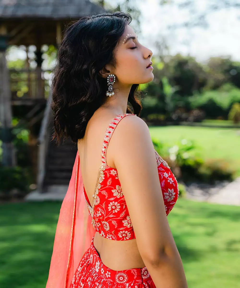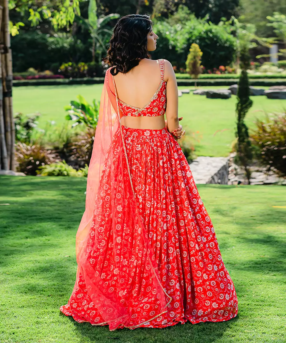 Featuring A Cherry Red Printed Lehenga Set In Georgette Base With Cutdana And Sequin Hand Embroidery. It Is Paired With Embroidered And Printed Georgette Blouse And Net Dupatta.