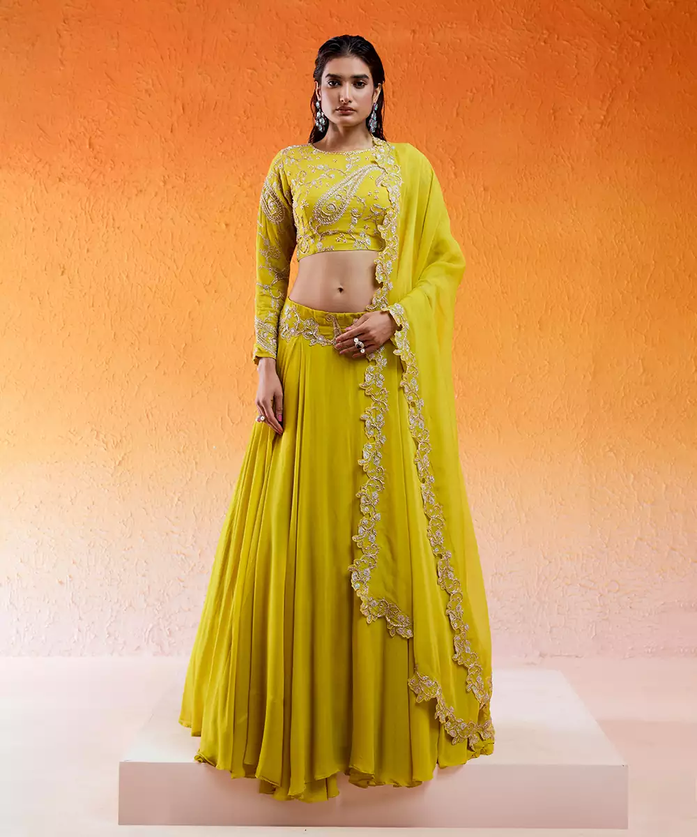 Featuring A Daisy Yellow Lehenga Set In Georgette Base With Threadwork, Cutdana And Moti Hand Embroidery. It Is Paired With A Matching Embroidered Georgette Blouse And An Organza Dupatta. Color : Daisy Yellow