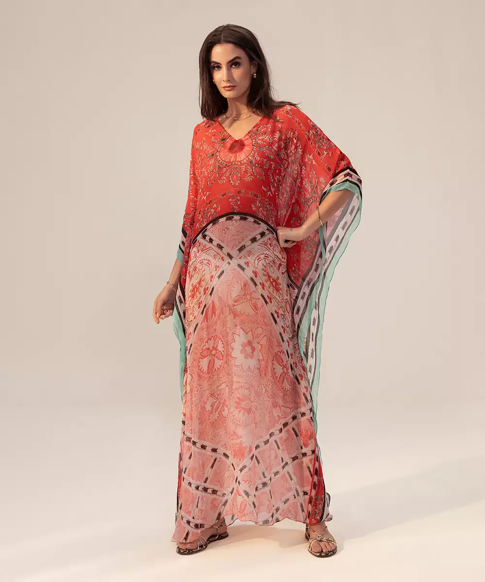 Bemberg Chiffon Ethnic Printed V Neck Kaftan In Relaxed Fit With Separate Cotton Slip.