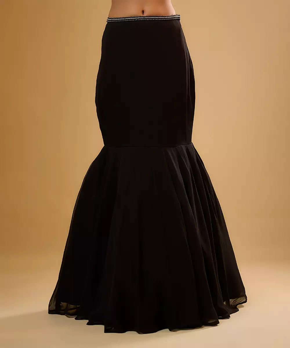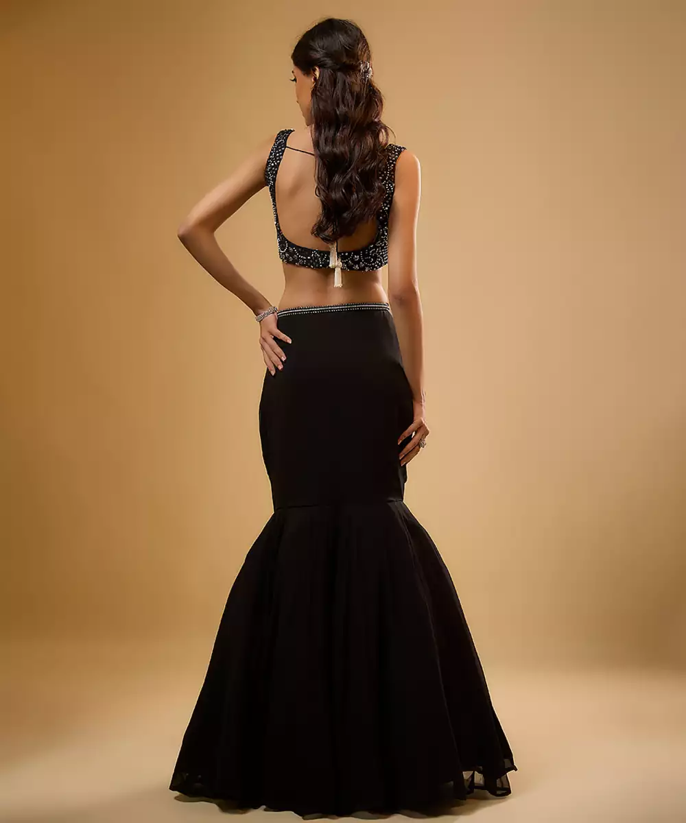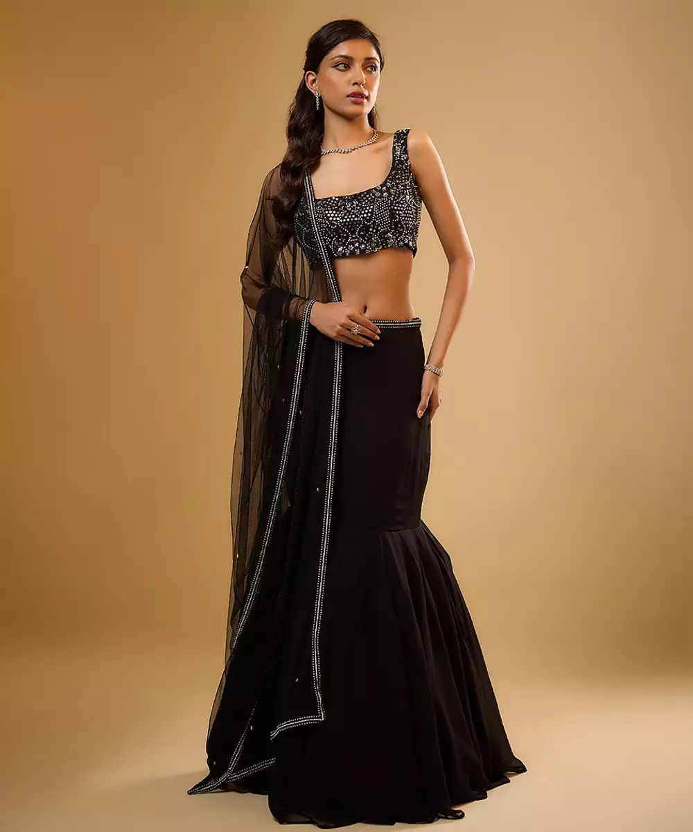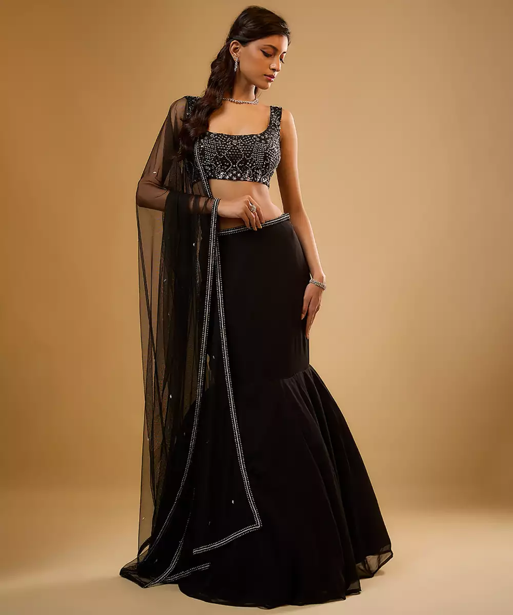 This Set Features A Black Georgette Lehenga Set. The Ensemble Has A Plain, Fish Cut Lehenga With A Sleeveless Blouse. The Blouse Is Embroidered With Ivory Sequins &Glass Beads In An Abstract Pattern. A Net Dupatta With Matching Border And Buttis Completes The Look. Cancan Is Included.