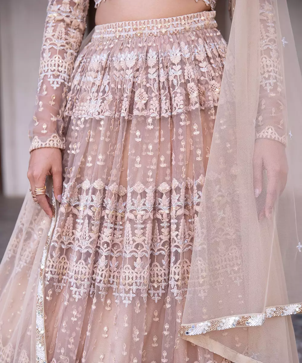 Features A Champagne Gold Lehenga Set, Embroidered All Over In Thread, Dori And Sequins. It Is Teamed With A Full Sleeves Blouse With Wide Square Neck. A Matching Net Dupatta With Buttis And Handcrafted Border Completes The Look.