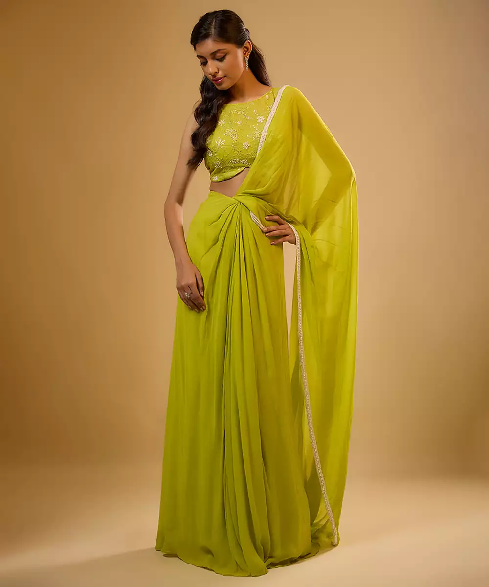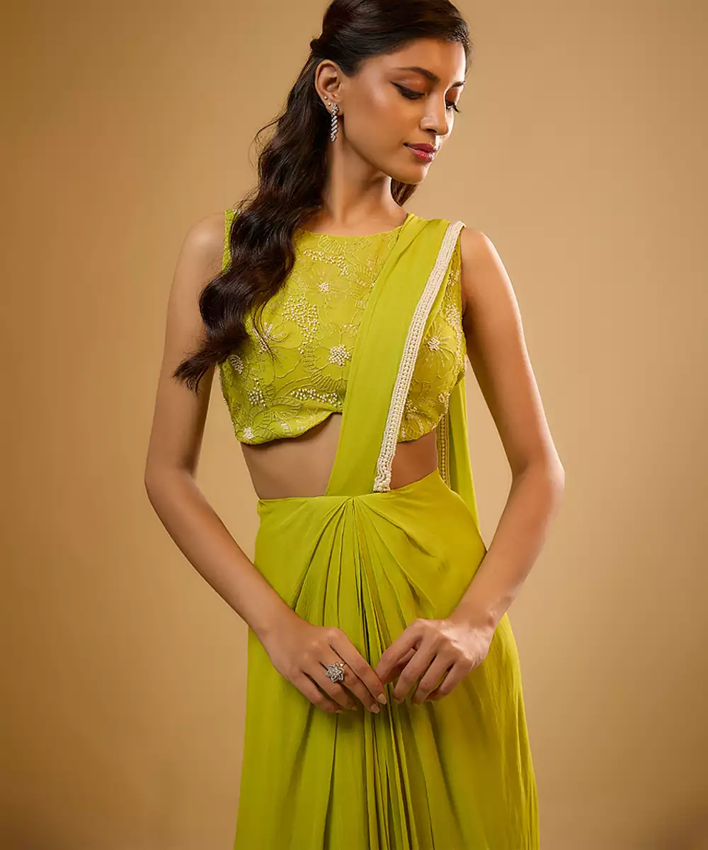 This Look Features A Citrus Green Draped Saree Set. The Ensemble Has A Pre Draped And Stitched Skirt And An Attached Palla. The Sleeveless Blouse Has Floral Threadwork, Sequins And Ivory Glass Beads Embroidery. The Palla Is Finished With A Matching Border.