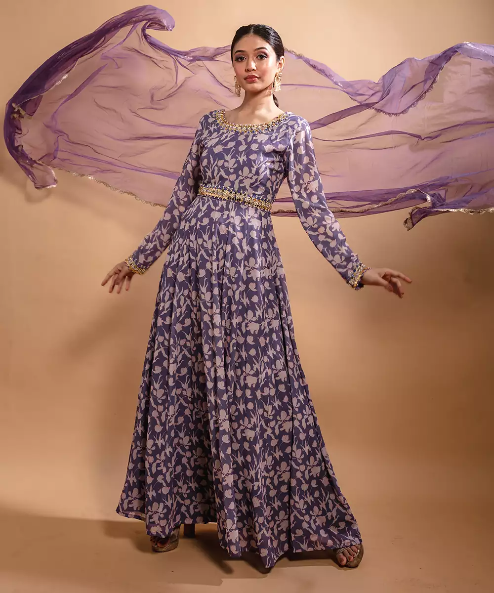 Featuring A Purple Printed And An Embroidered Anarkali Paired With A Dupatta.