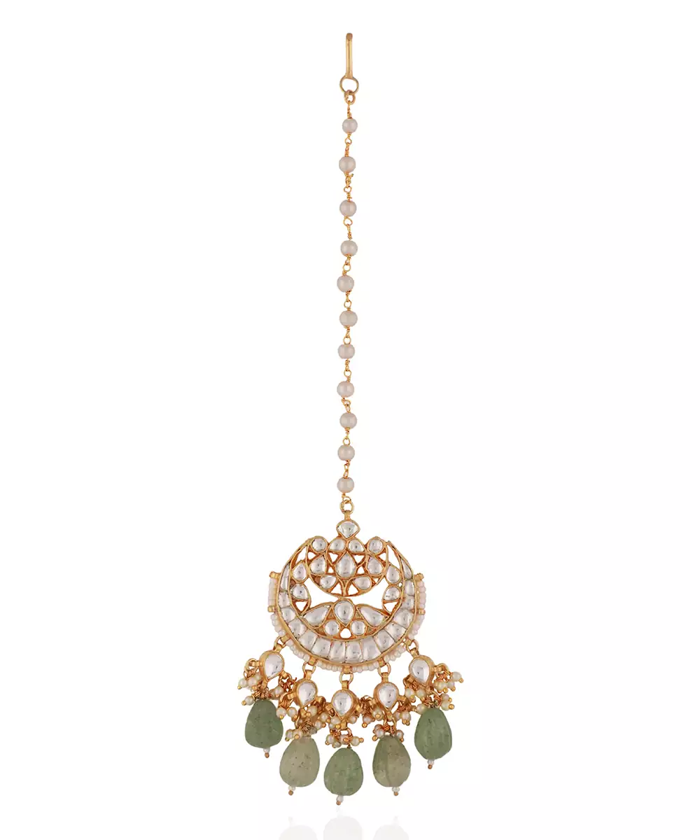 Featuring Stunning Bridal Chand Tikka With Its Unique Jade Shade, Mesmerizing Intricate Details And 22kt Gold Plating. Materials : Silver, Copper, Gold Plating Beads : Semi Precious Stones, Pearls Components : 1 Maang Tikka