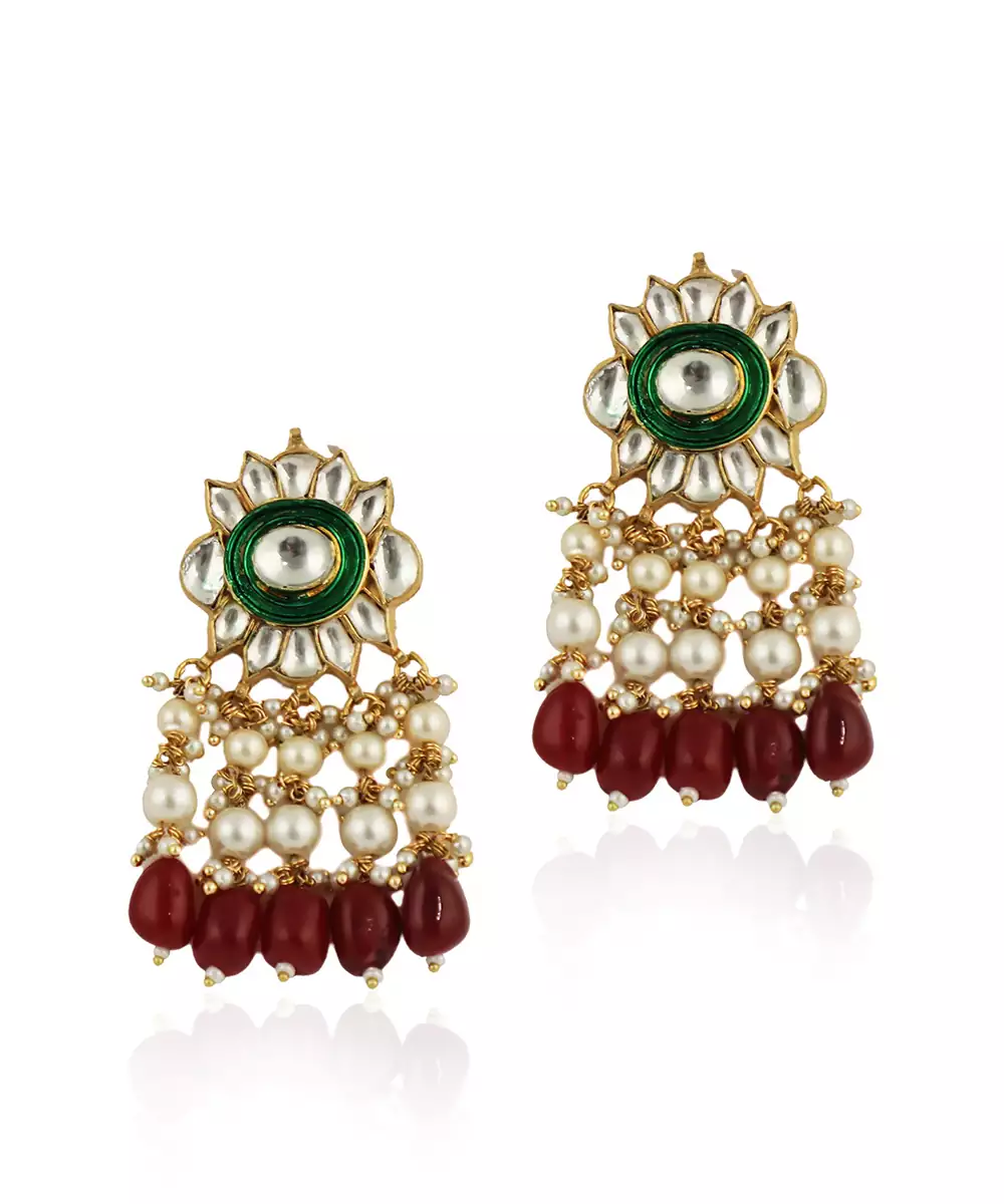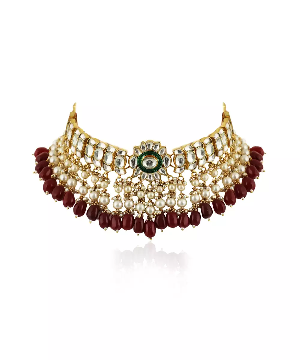 Featuring Red Beads With Green Meenakari White Jadtar Choker Set.
