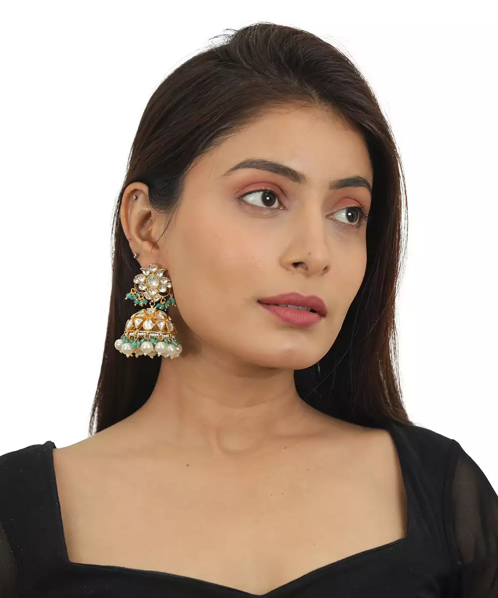 Featuring White Jhumki With Pearl And Sea Green Hangings.