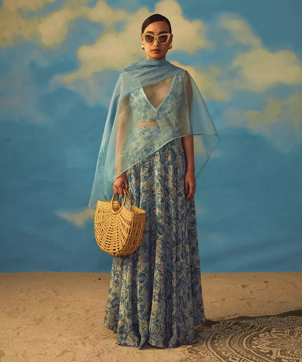 Featuring A Acqa Blue Autumn Bouquet Set. It Includes Deep Neck Crop To Paired With Flared Long Skirt With Crepe Base And Organza Dupatta With Exquisitely Antique Cut Daana Detailed Embellishment On Top And Skirt