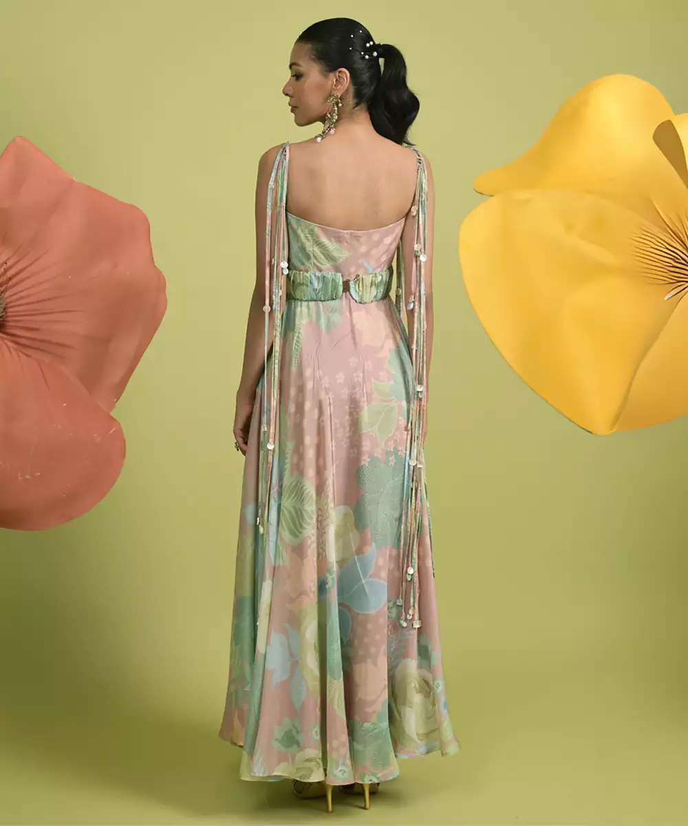 Baby Pink Floral Print Cotton Dresses Fabric: Soft Spun Muslin Main Color: Dusty Pink Design Elements: Trim Adornment, Embellished Cord & Intricate Braids. Includes: Maxi & Belt