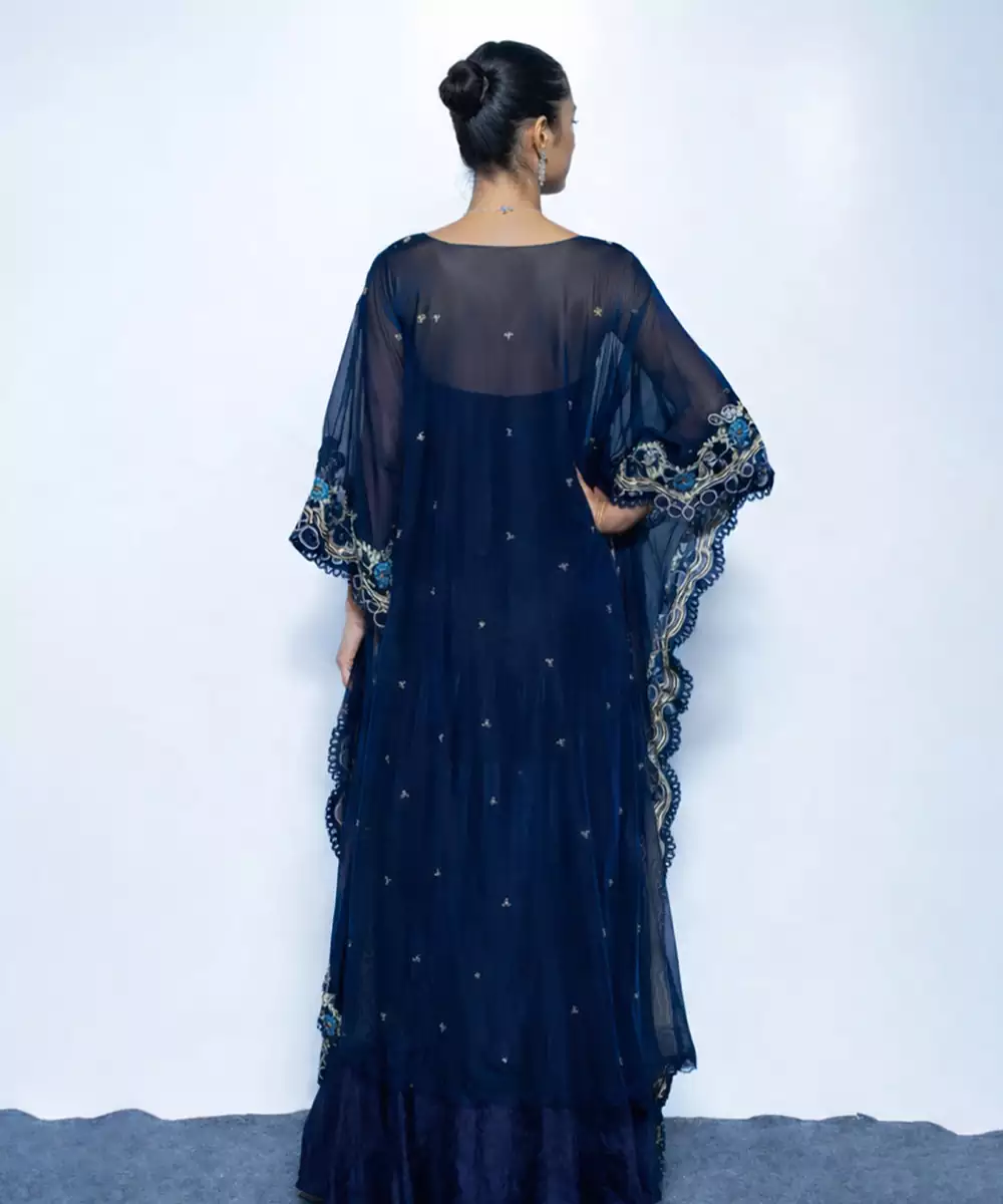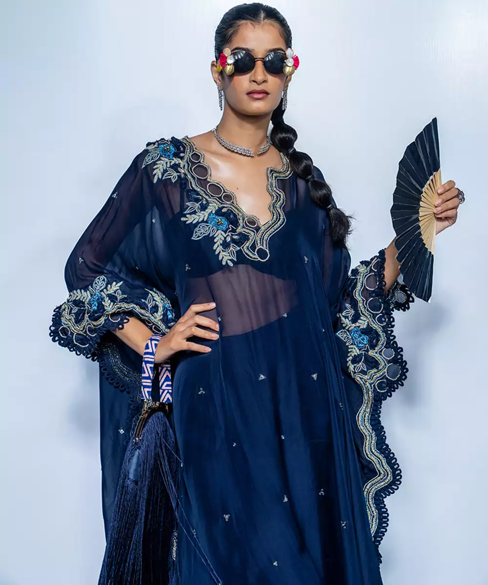 This Blue Chanderi Kaftan Set Features Delicate Embroidery That Adds Charm To Its Relaxed Silhouette. The Breathable Fabric And Subtle Sheen Offer Comfort With Style, Making It Perfect For Festive Evenings, Casual Celebrations, And Modern Ethnic Looks.
