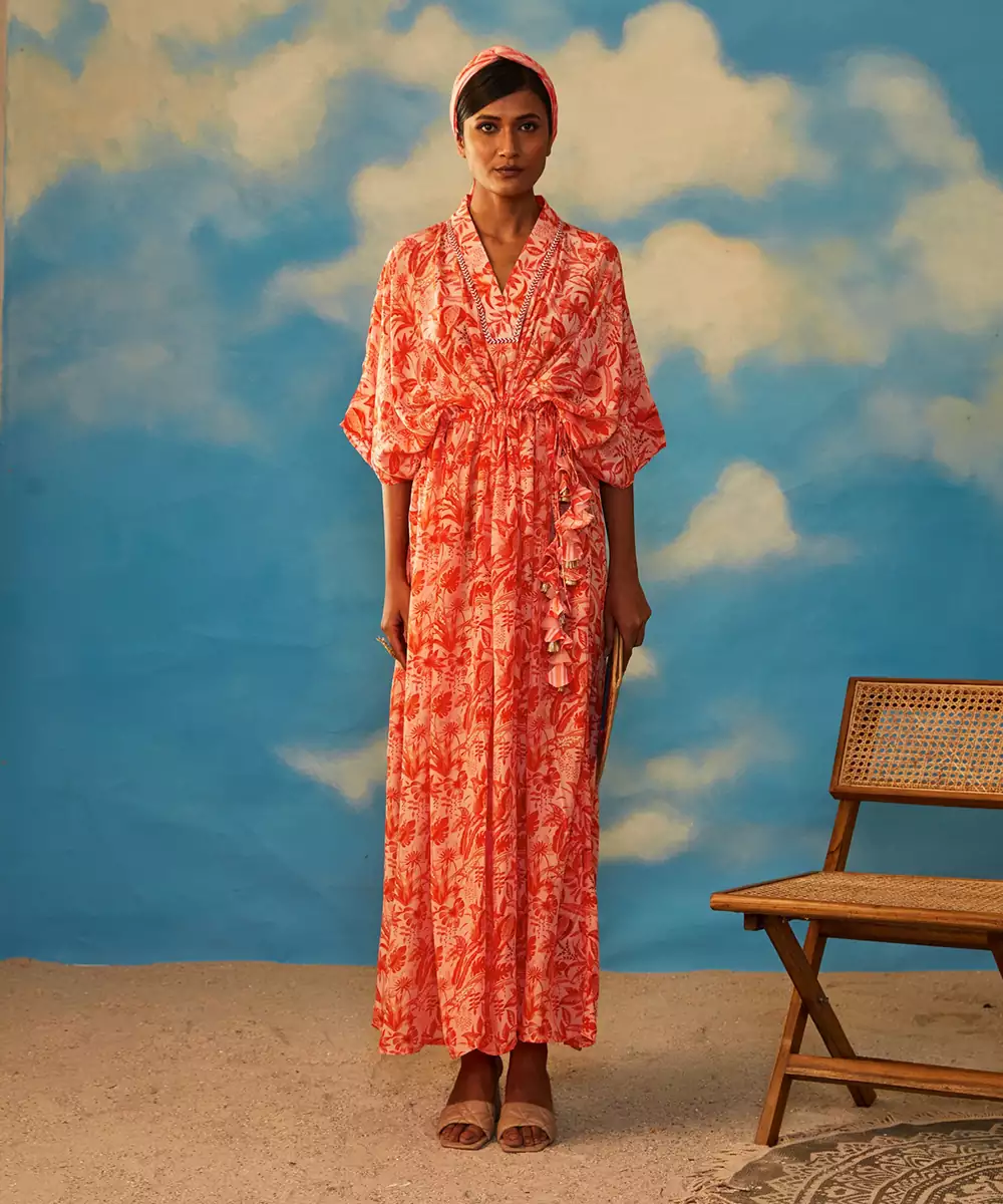 Putting Forward A Gorgeous Burnt Orange Kaftan With Blooming Fresh Vibes Made Out Of Crepe Fabric