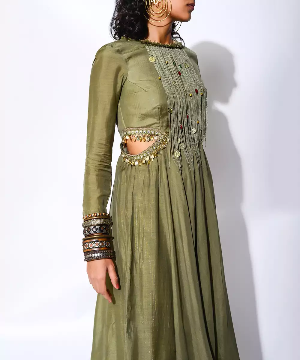 Featuring An Olive Green Short Anarkali In Crepe Base. It Is Paired With A Matching Color Palazzo