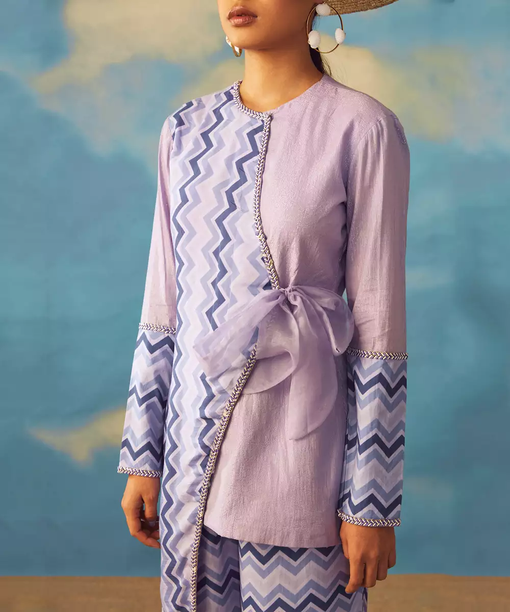 Presenting A Whole Vacay Vibe Sugarplum Set In A Periwinkle Shade Of Blue With Asymmetric Tunic Paired Together With Straight Leg Pants. The Base Fabric Used Is Rayon And Cotton Lurex With Detailing Of Cut Dana Work