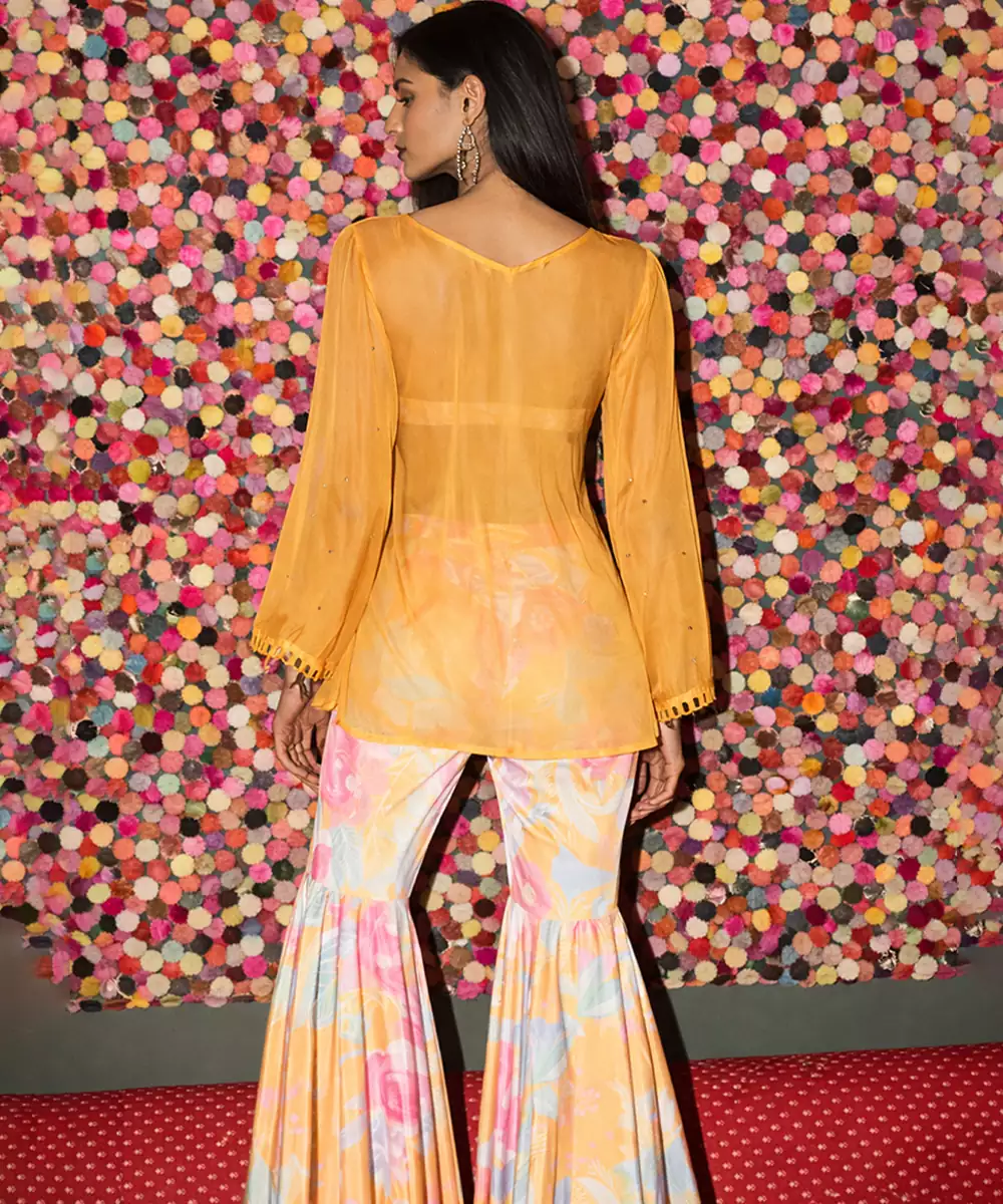 A Radiant Yellow Gharara Set Crafted In Flowy Organza And Detailed With Intricate Embroidery For A Festive Finish. The Flared Silhouette And Delicate Fabric Create A Graceful Movement, Making It Ideal For Mehendi Functions, Wedding Festivities, And Celebratory Gatherings.