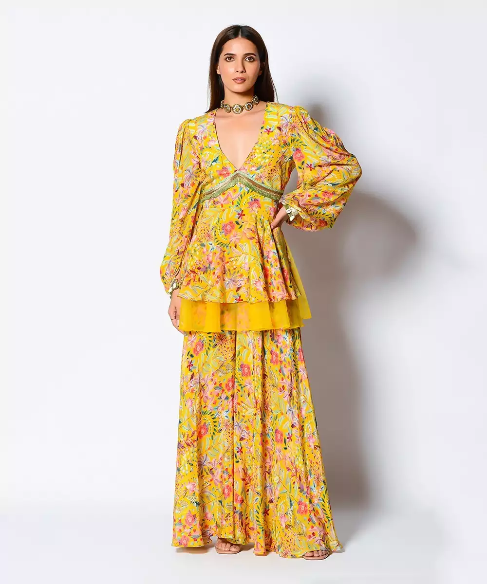Featuring A Marigold Crepe Peplum Top Paired With Flared Pants Enhanced With Applique Work At Waist Edge And Embroidered Cuff.