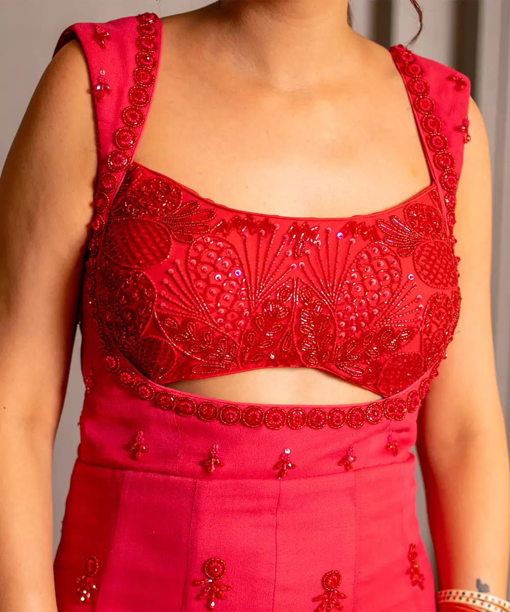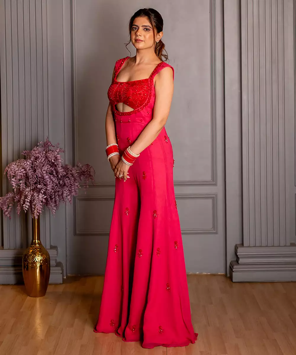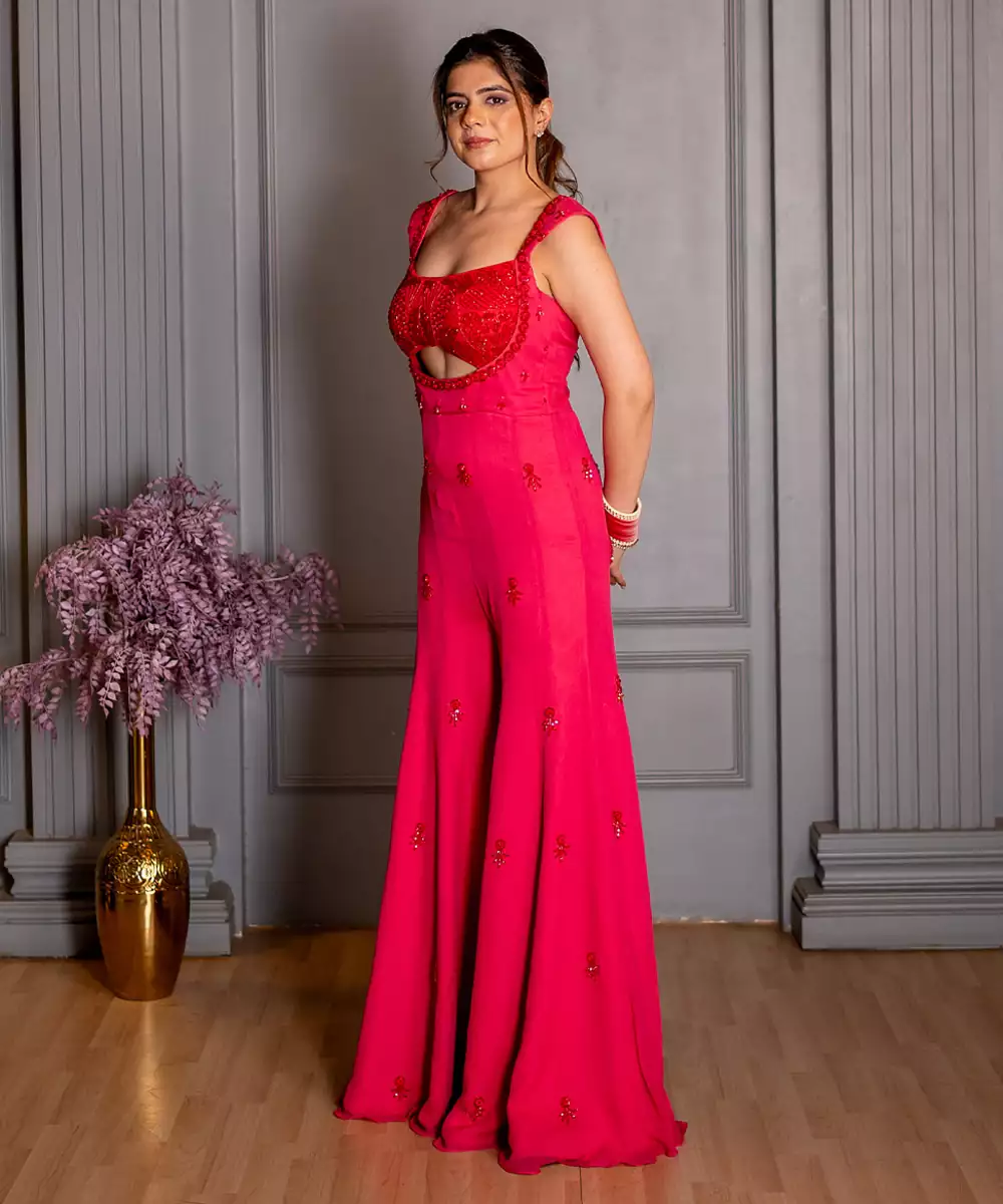 This Pink Embroidered Georgette Jumpsuit Exudes Effortless Elegance And Modern Charm. Crafted From Lightweight Georgette Fabric, It Features Intricate Embroidery That Adds A Graceful, Refined Touch. Perfect For Festive Occasions And Celebrations, It Offers A Stylish Silhouette With Comfortable, Contemporary Appeal.
