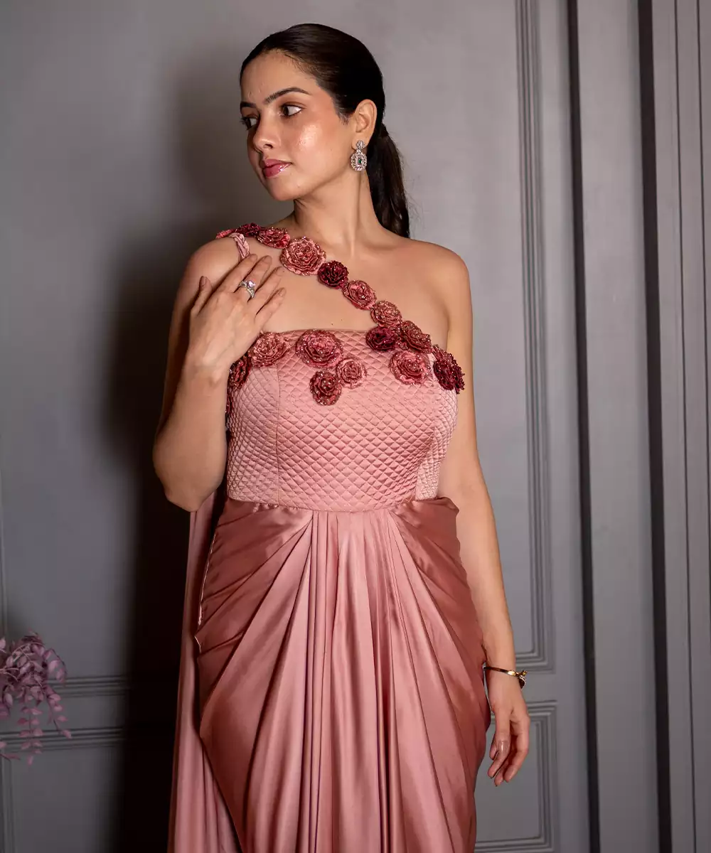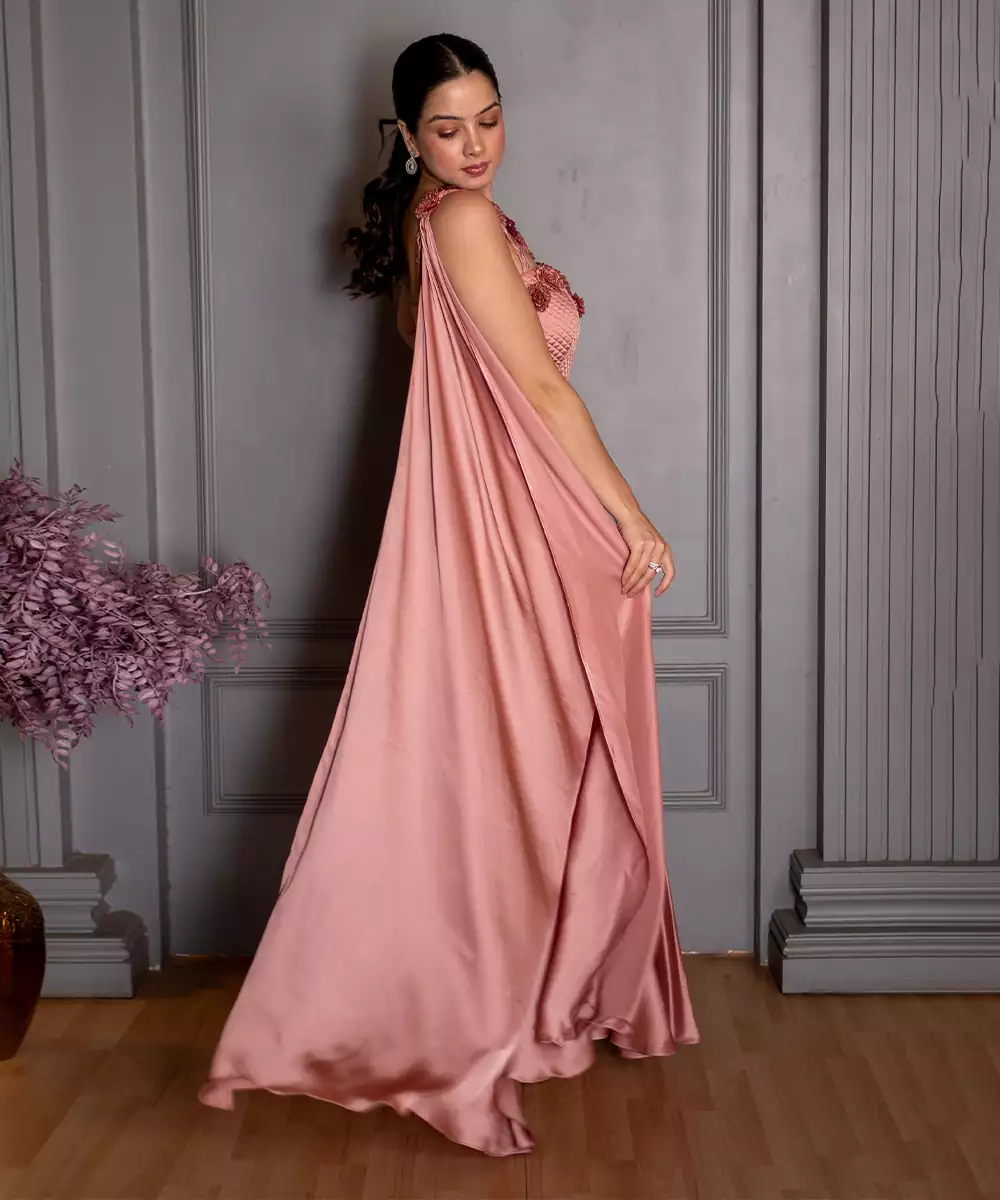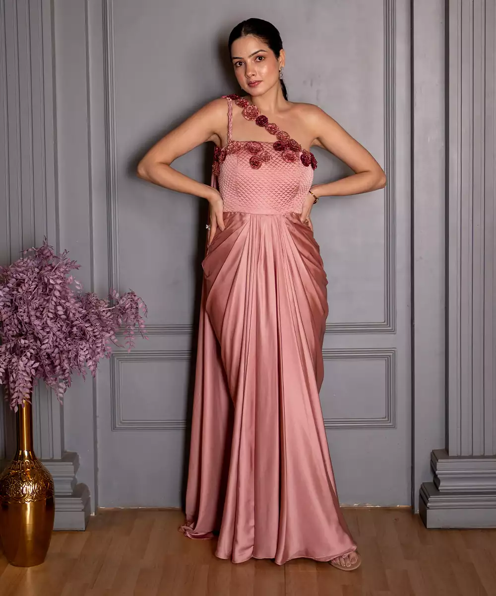 This Pink Embroidered Satin Gown Exudes Refined Elegance And Feminine Charm. Crafted From Lustrous Satin Fabric, It Features Intricate Embroidery That Adds A Graceful, Luxurious Touch. Perfect For Weddings And Special Occasions, It Offers A Flattering Silhouette With Timeless Sophistication.