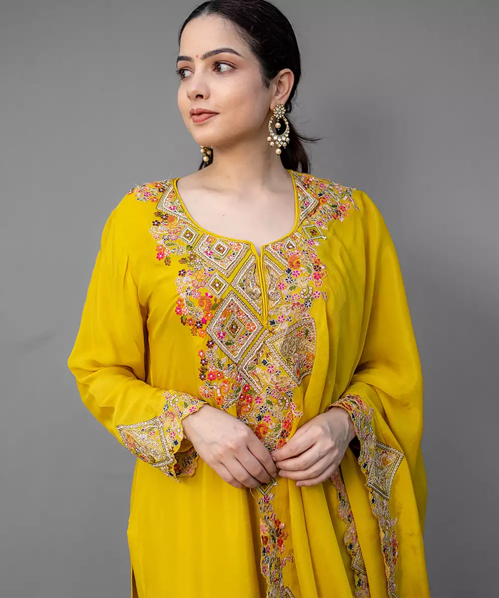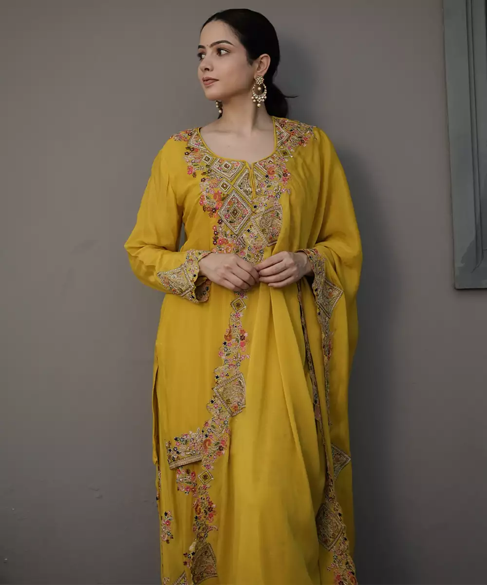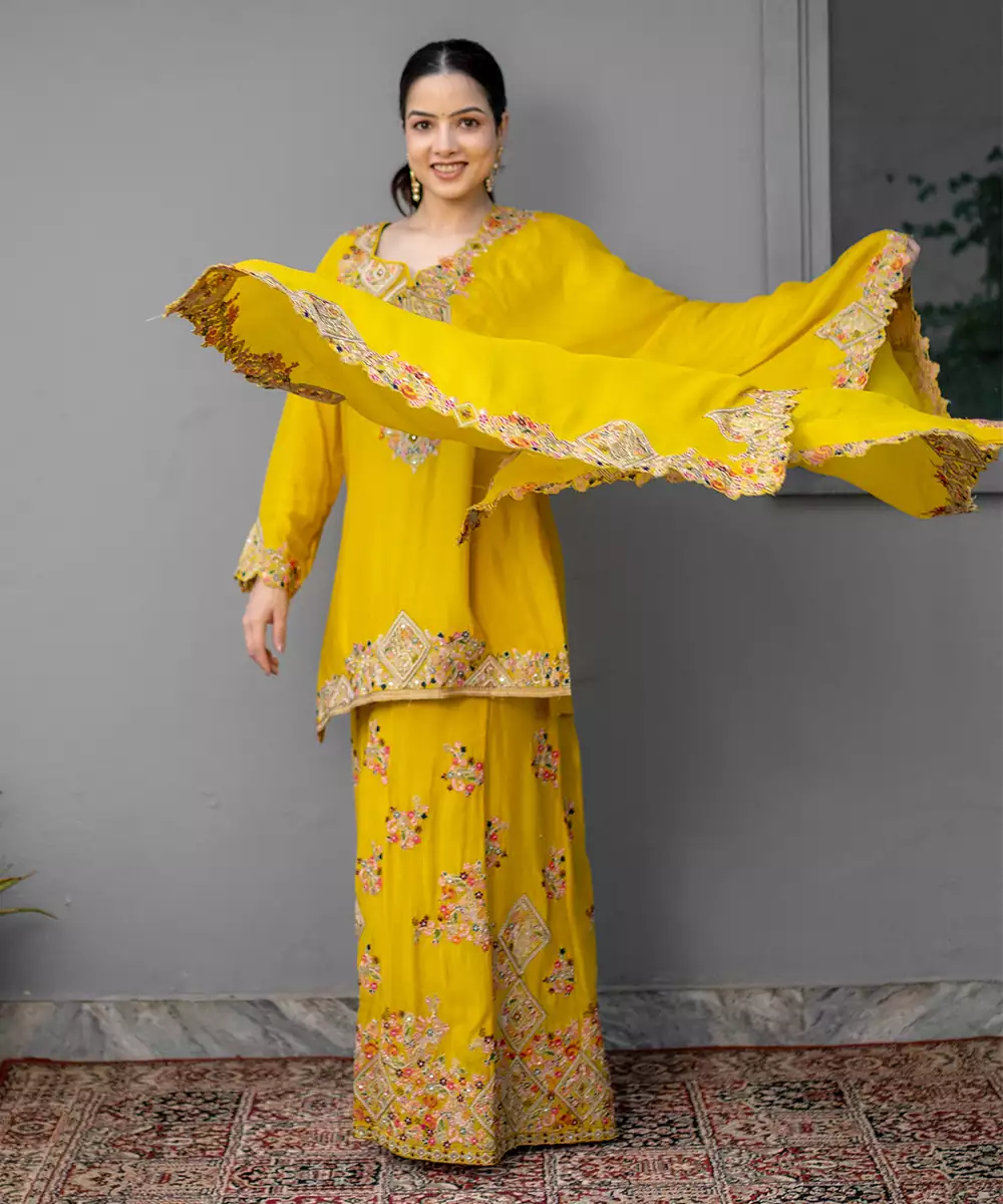 This Yellow Embroidered Chiffon Sharara Set Exudes Fresh Elegance And Festive Charm. Crafted From Lightweight Chiffon Fabric, It Features Intricate Embroidery That Adds A Graceful, Airy Touch. Perfect For Weddings And Celebrations, It Offers A Flowing Silhouette With Timeless Traditional Appeal.