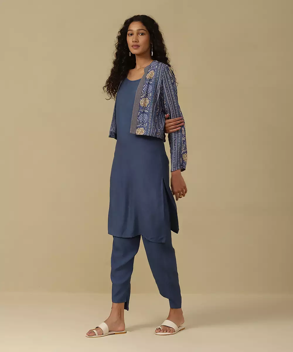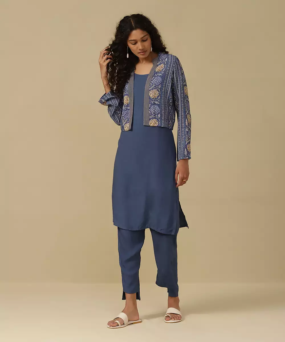 Featuring Denim Blue Floral Print Kurta With Salwar And Jacket. Colour : Blue Fabric : Rayon Components : 3 (Kurta, Pant, Jacket ) Work :Printed