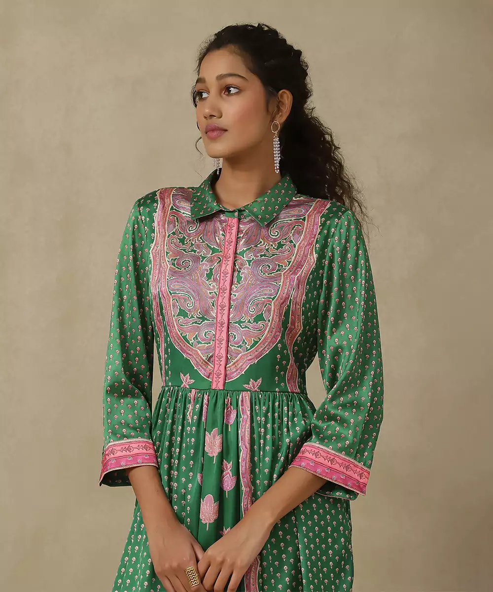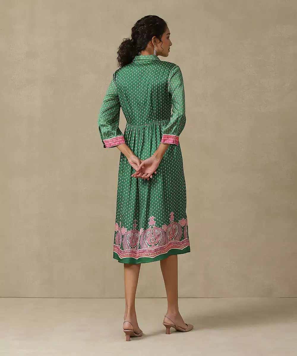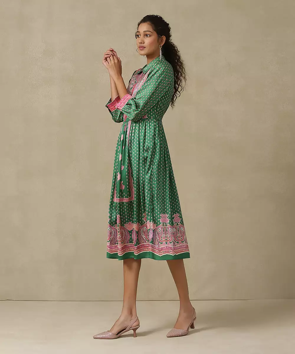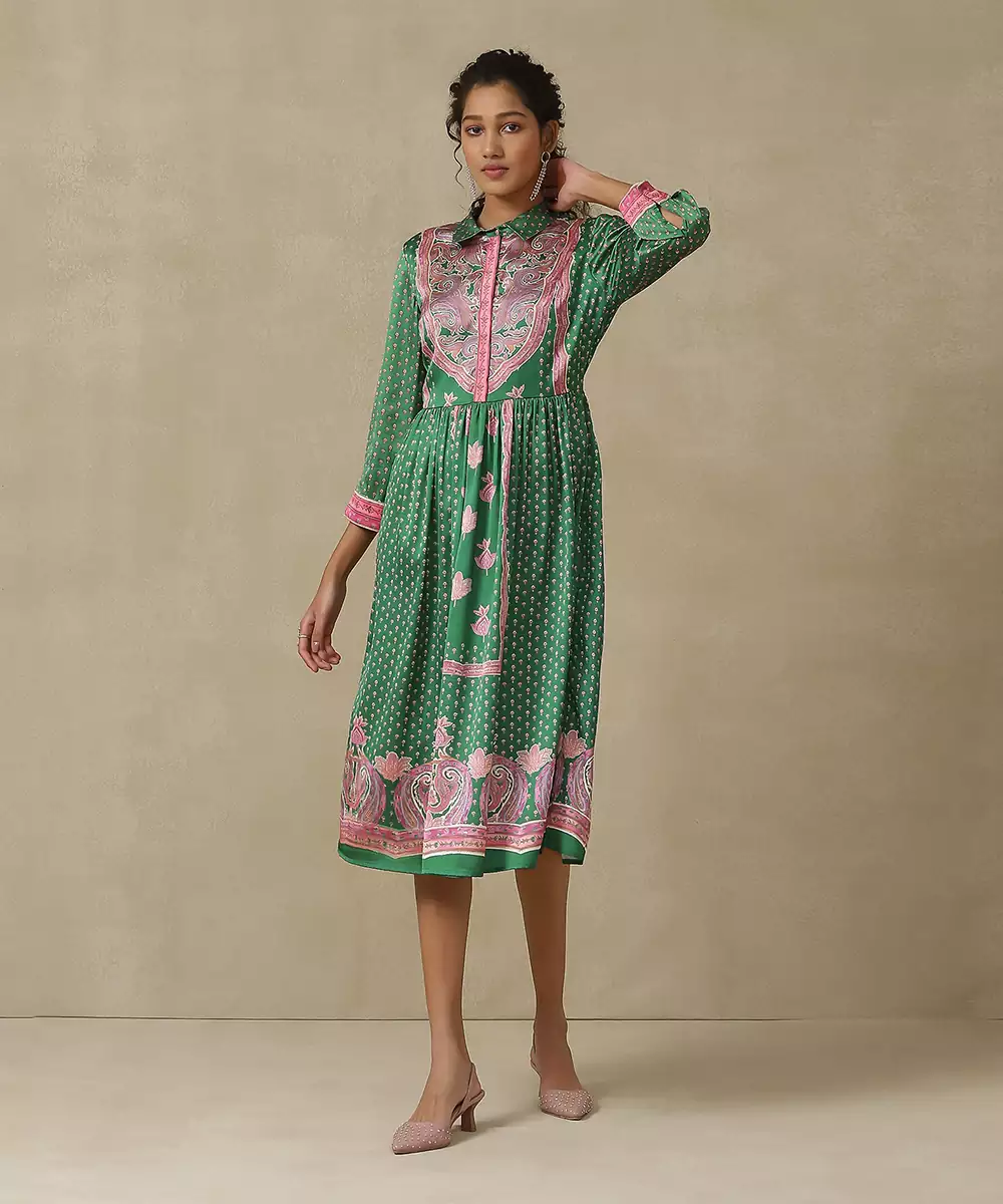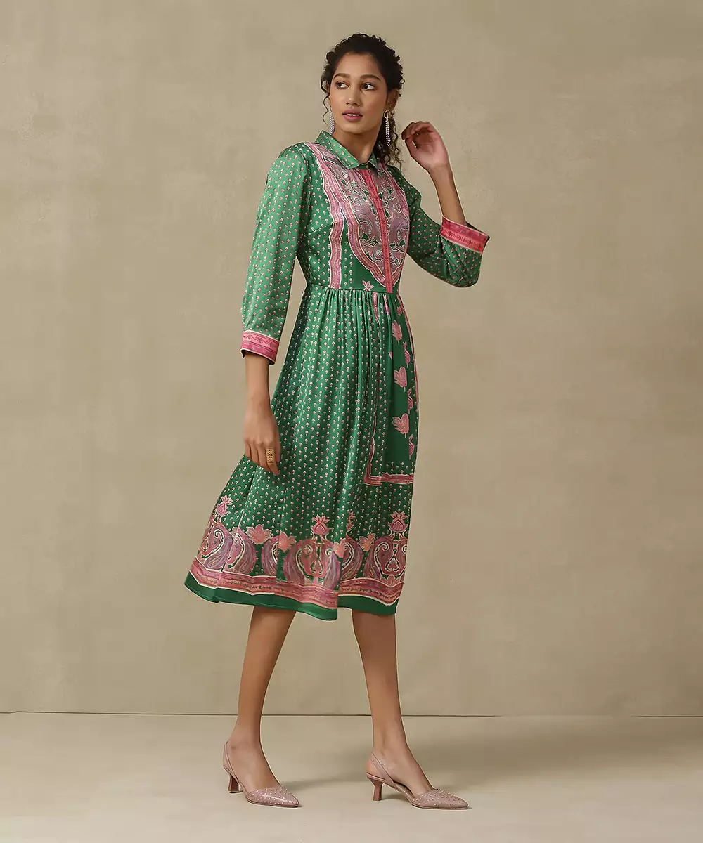 Featuring 3/4 Sleeve Band Collar Printed Dress. Colour :Green Fabric :Polyester Components : 1 (Dress) Work :Printed