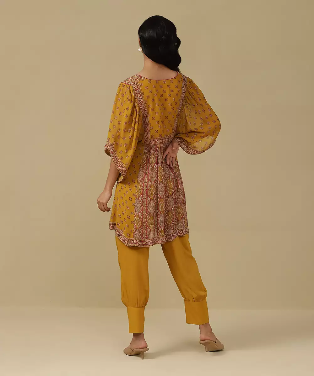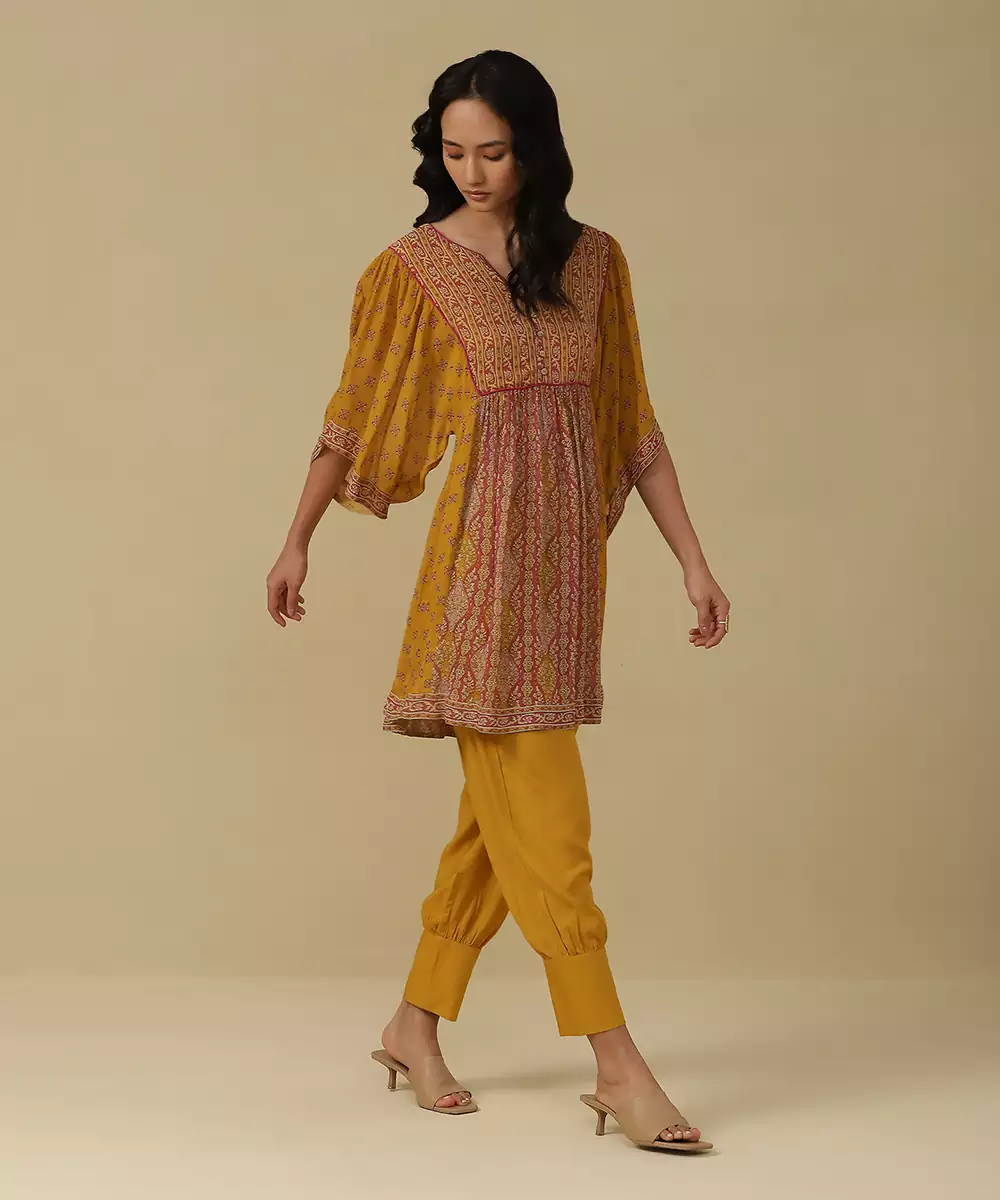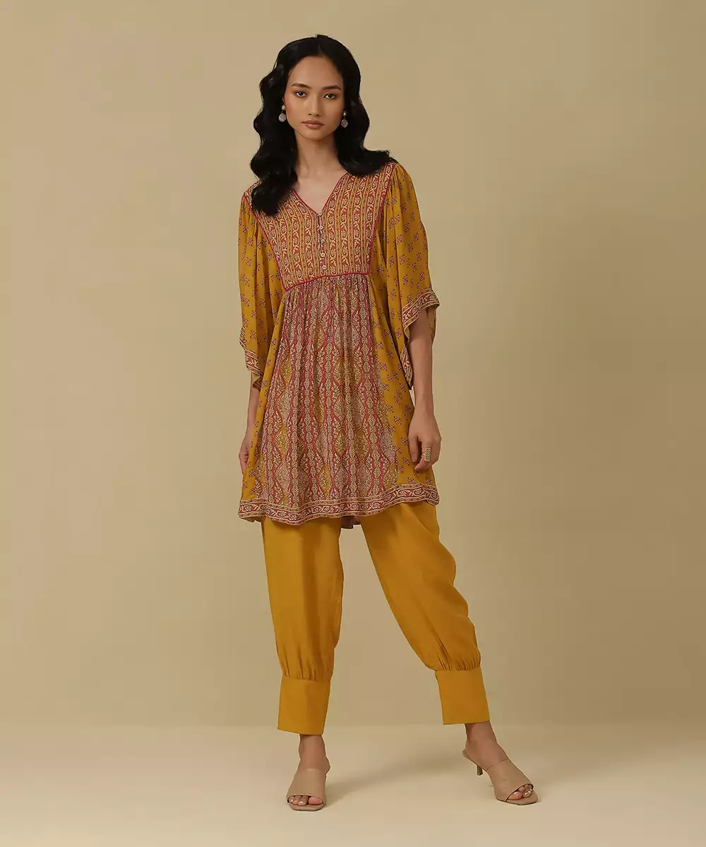 Featuring Mustard & Fuschia Printed Kurti With Pants. Colour :Yellow Fabric :Blended Cotton Components : 2 (Kurta,Pant ) Work :Printed