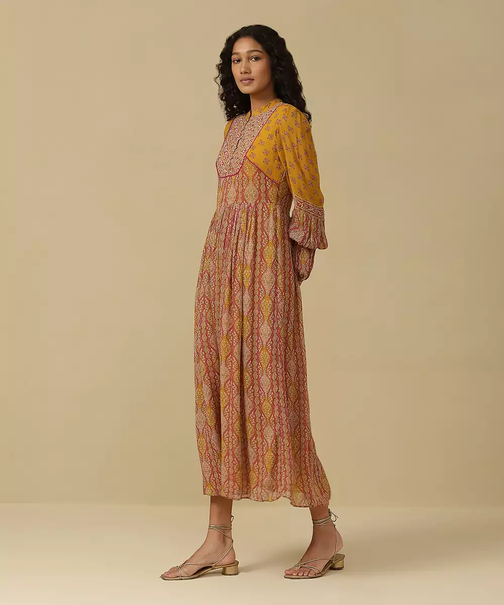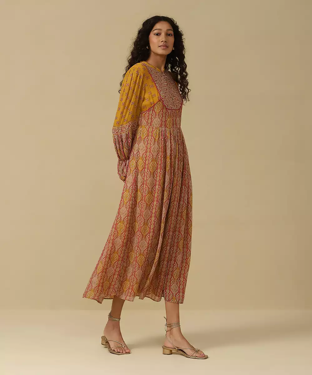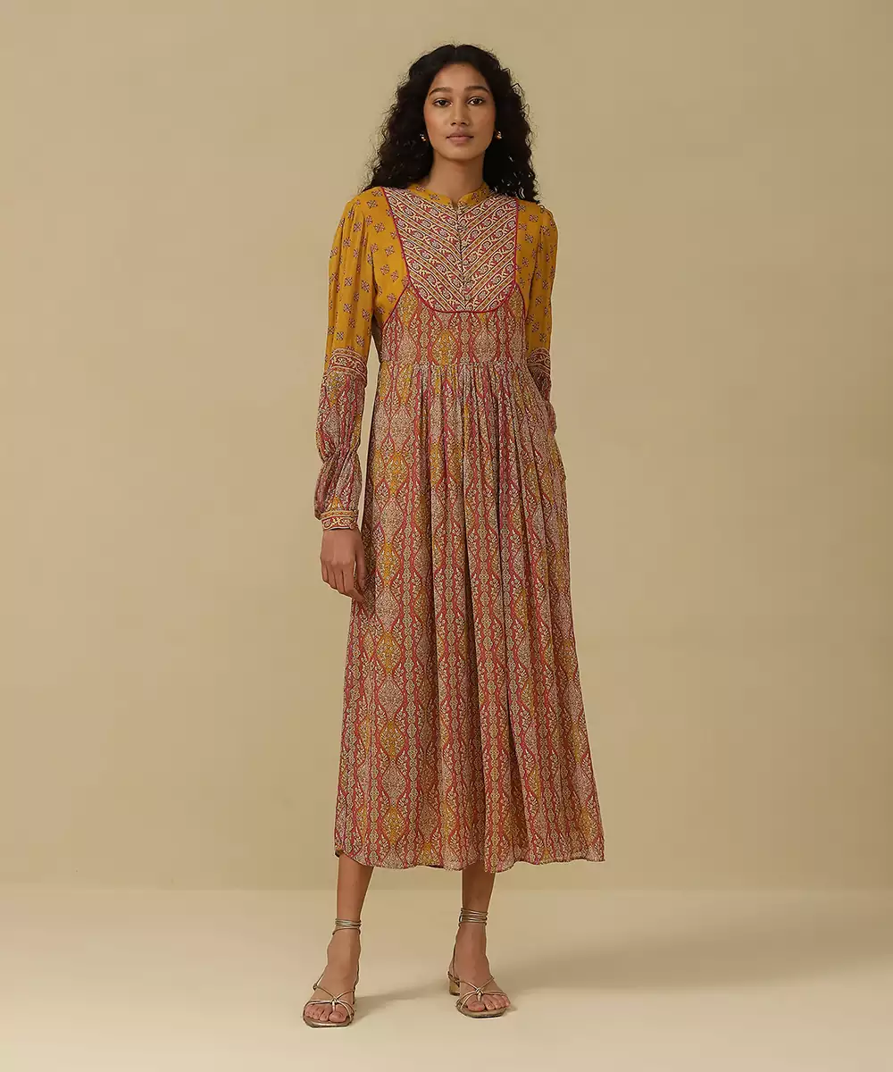 "Featuring Mustard & Fuschia Printed Long Dress. Colour :Beige Fabric :Blended Cotton Components : 1 (Dress) Work :Printed"