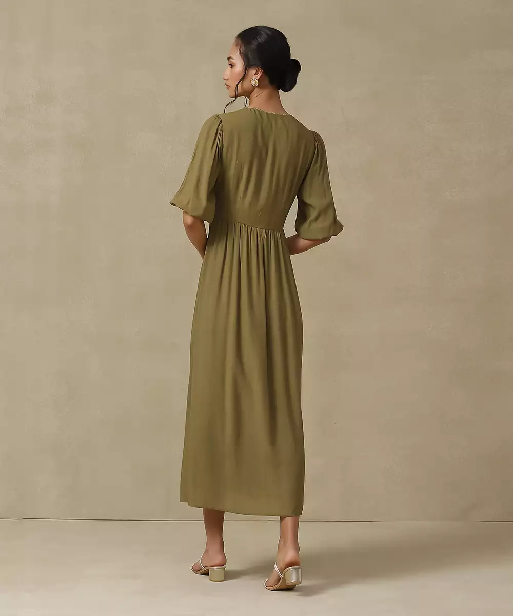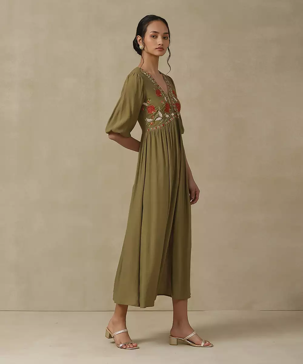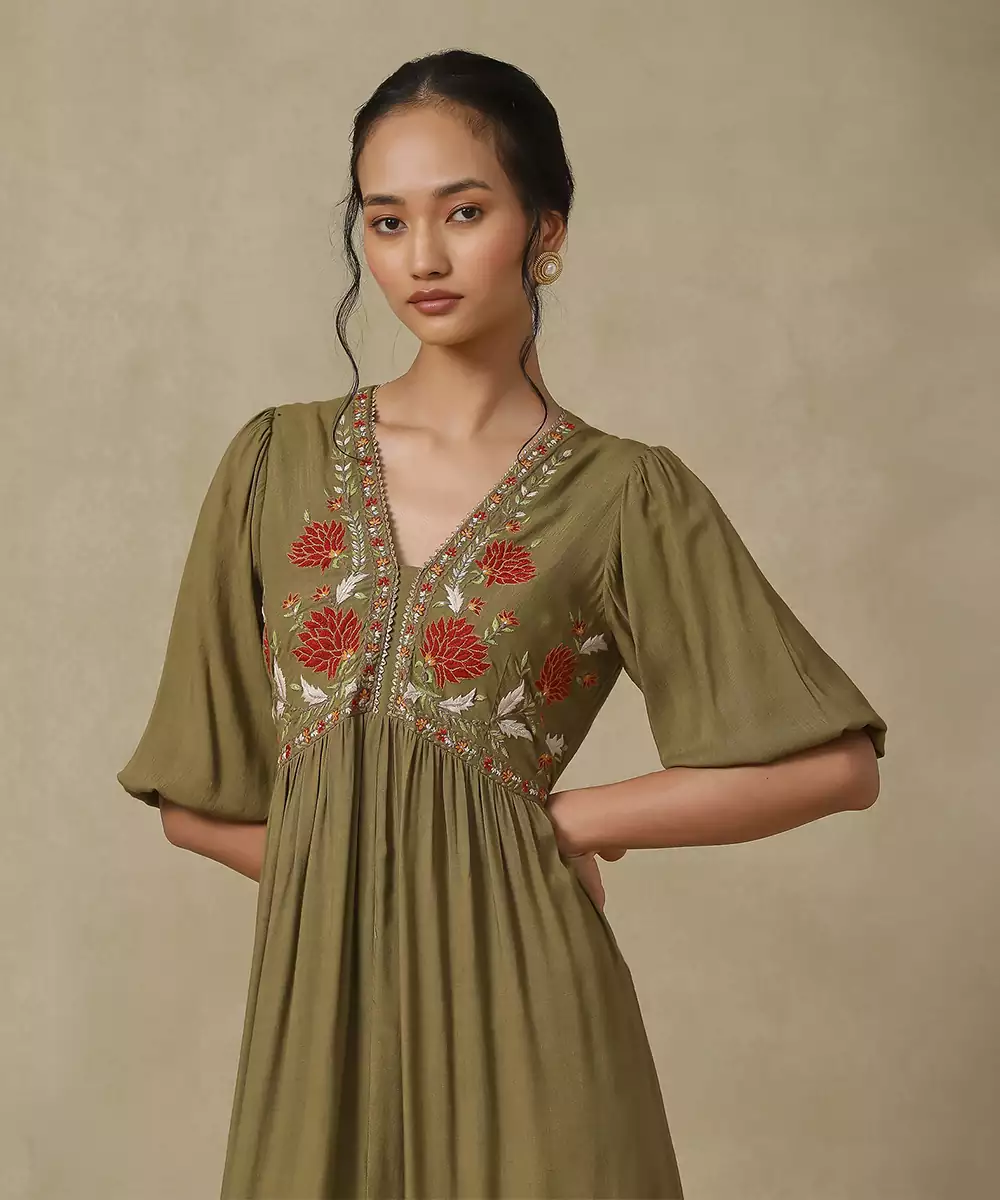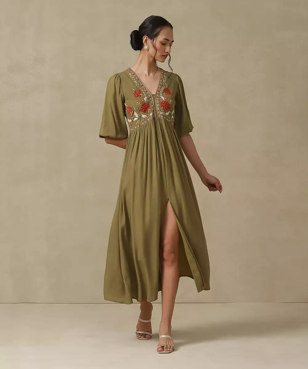 Featuring Olive Floral Embroidered Long Dress. Colour :Olive Fabric :Rayon Components : 1 (Dress) Work :Embroidered