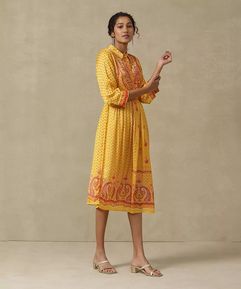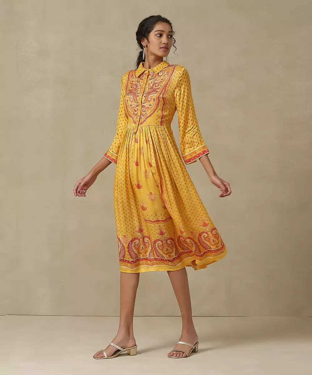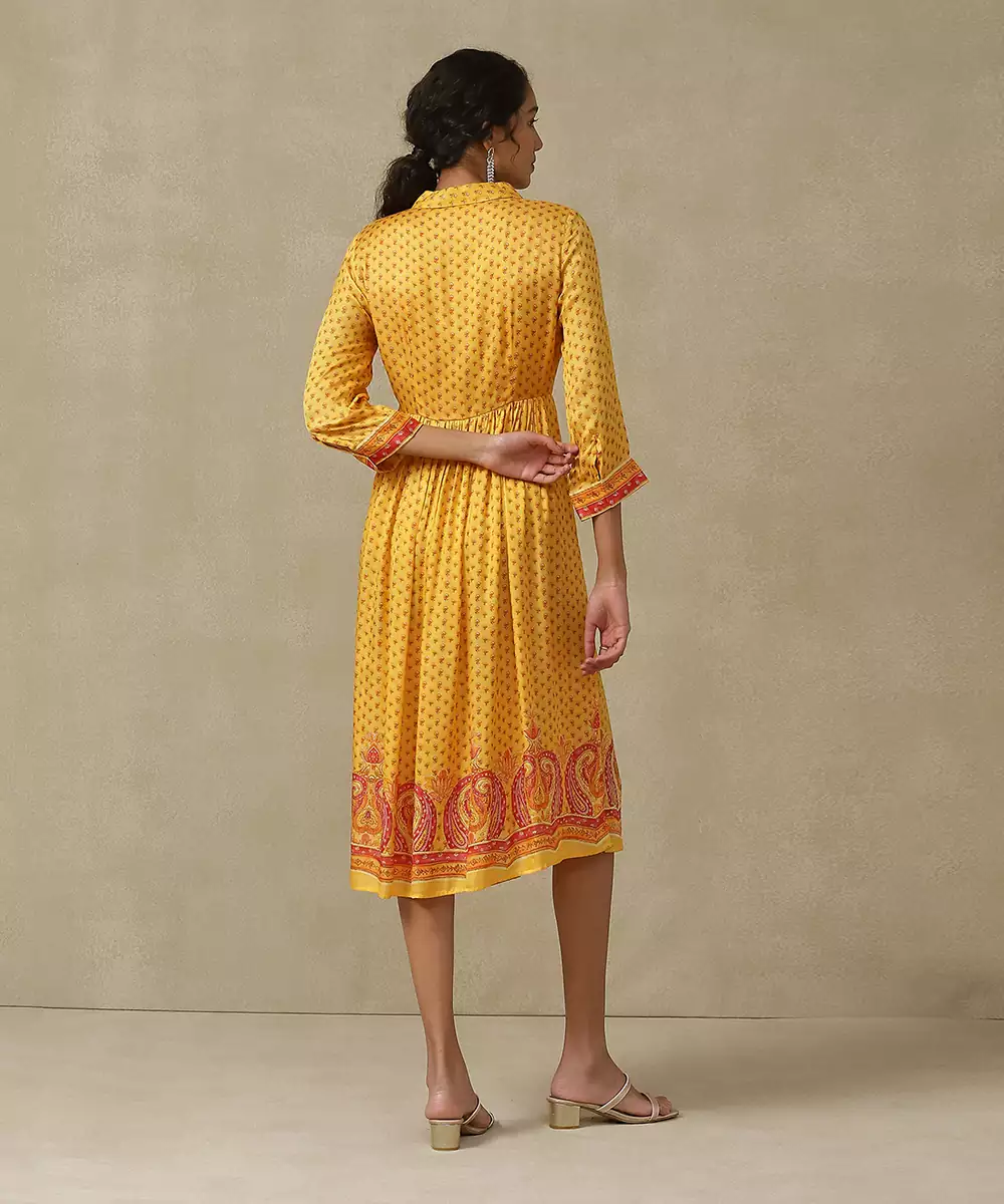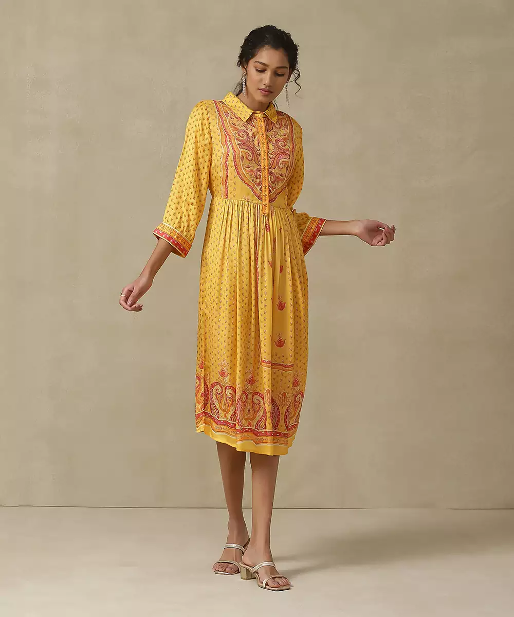 Featuring 3/4 Sleeve Band Collar Printed Dress. Colour :Yellow Fabric :Polyester Components : 1 (Dress) Work :Printed