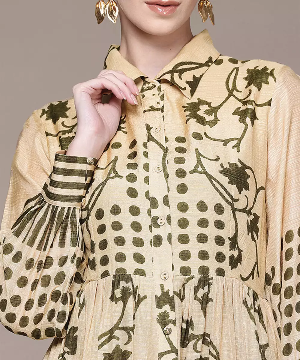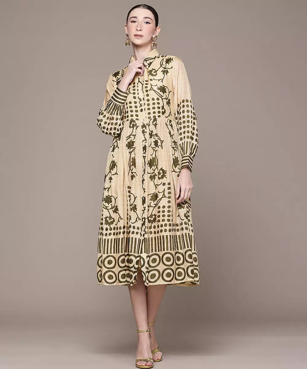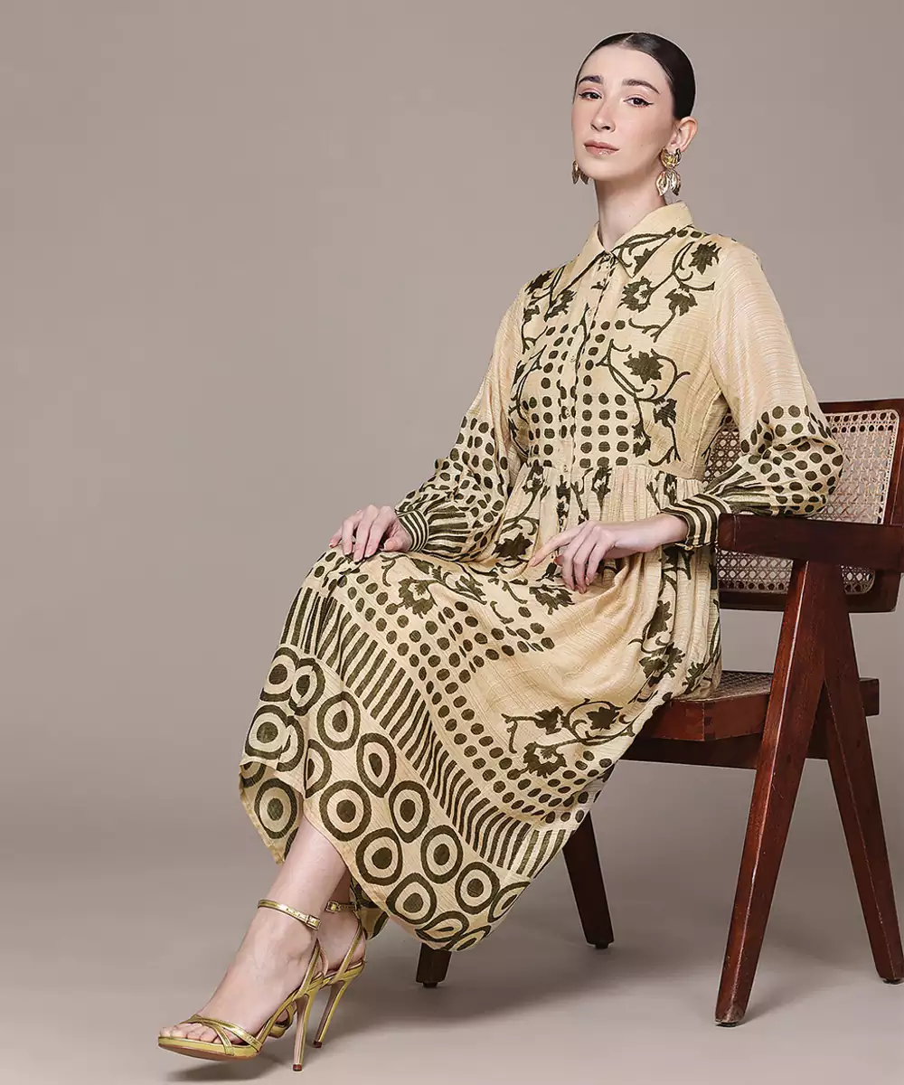 This Beige Printed Viscose Dress Offers A Subtle And Elegant Look With Soft Patterns On Smooth Fabric. The Comfortable Fit Ensures Ease Of Wear, Making It Perfect For Everyday Styling. A Versatile Outfit That Combines Simplicity With A Refined And Modern Touch.