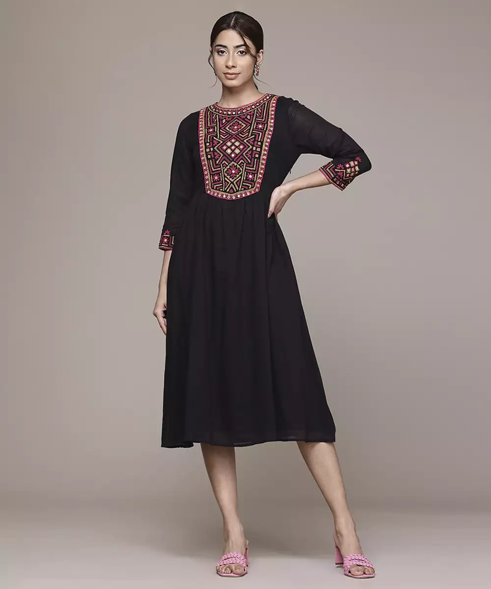 This Black Cotton Dress Features Embroidered Work On Soft And Breathable Fabric. The Cotton Material Ensures All Day Comfort With A Natural And Relaxed Feel. Full Sleeves Provide Balanced Coverage And A Structured Silhouette. The Embroidery Adds Refined Detailing While Maintaining A Simple And Elegant Appearance. The Stitched Construction Offers A Ready To Wear Form. Suitable For Casual Wear And Semi Formal Occasions, This Dress Delivers A Timeless And Versatile Look.