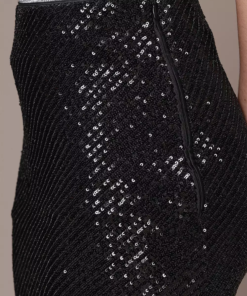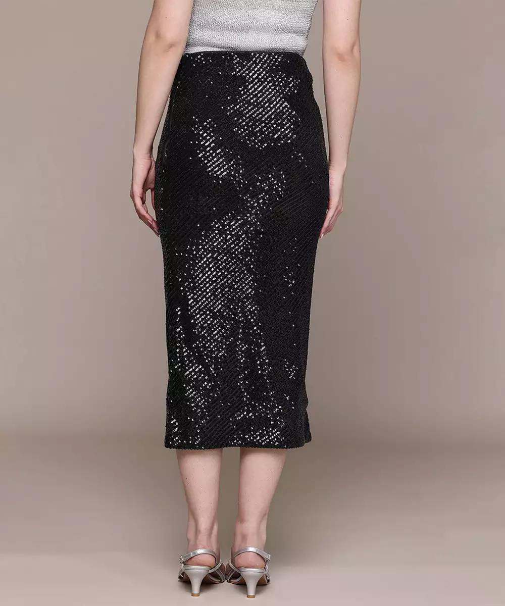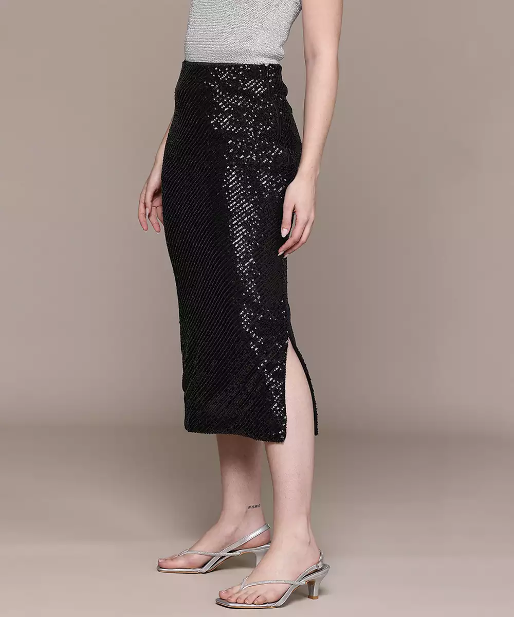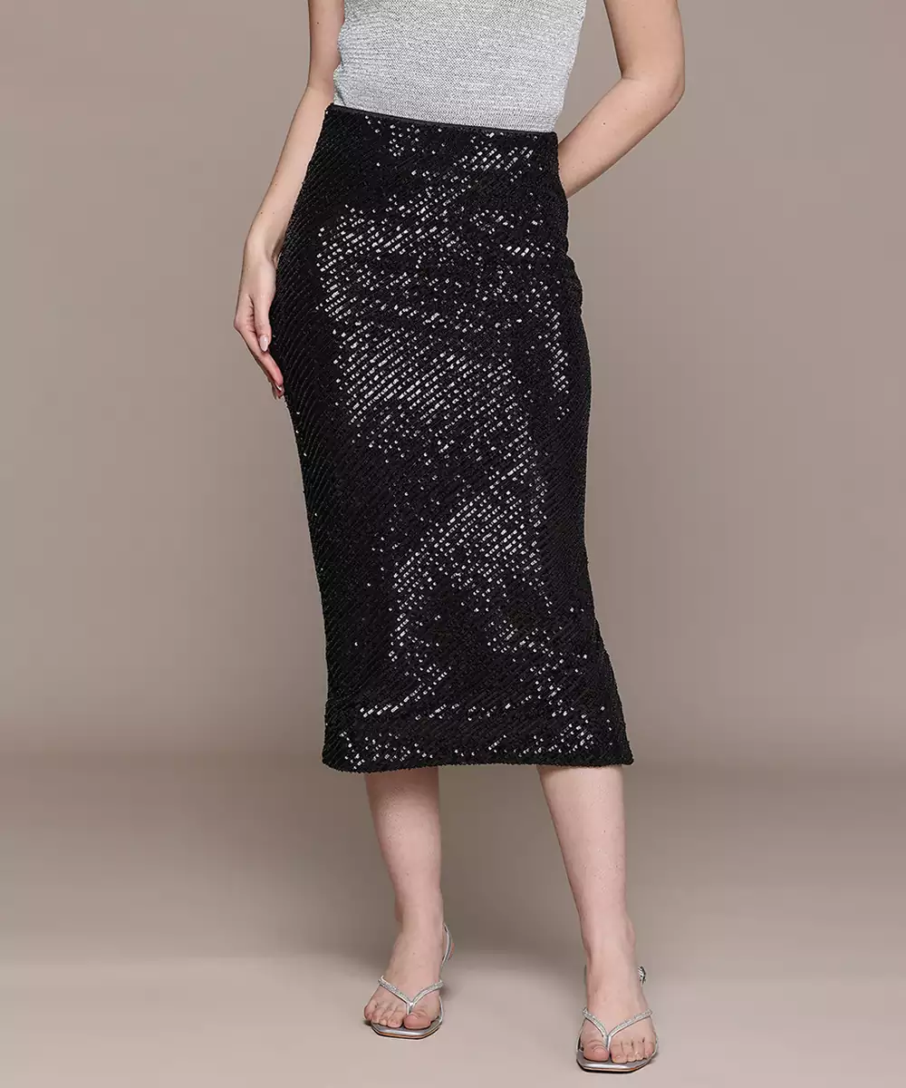 This Black Embellished Viscose Skirt Features Delicate Detailing That Adds A Touch Of Glamour. The Smooth Fabric Ensures Comfort, While The Elegant Design Makes It Suitable For Festive And Evening Wear. A Stylish Piece That Blends Sophistication With Modern Flair, Perfect For Making A Subtle Statement.