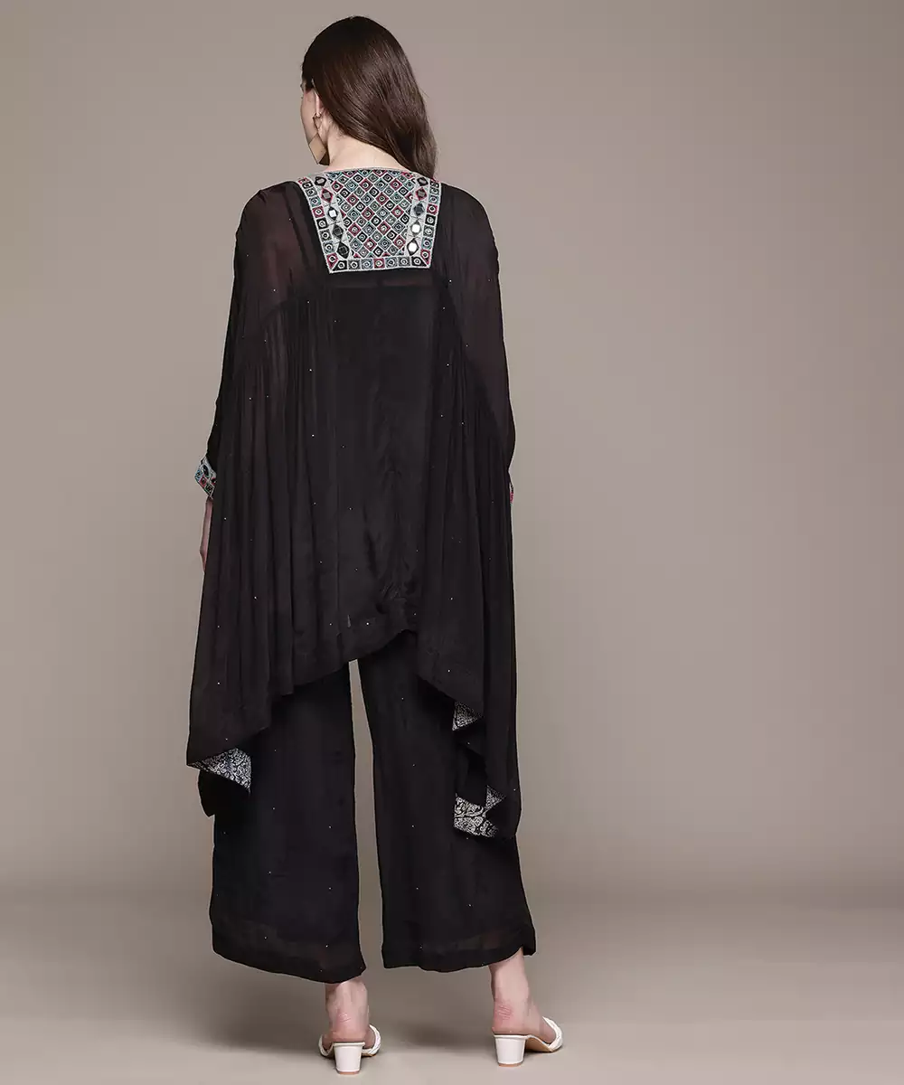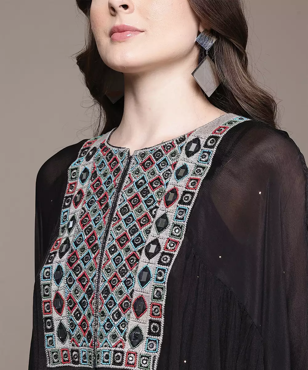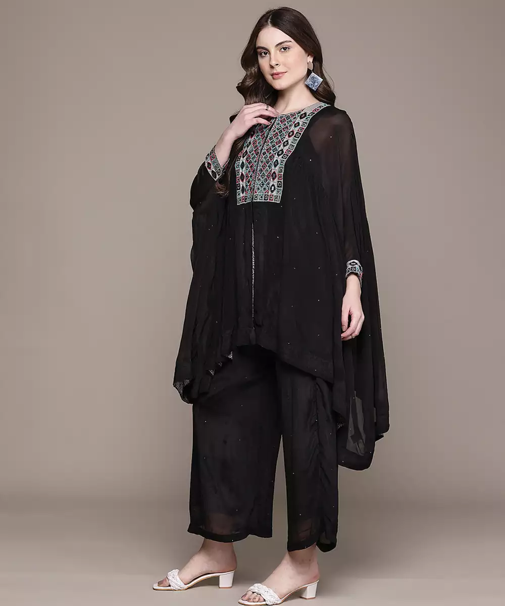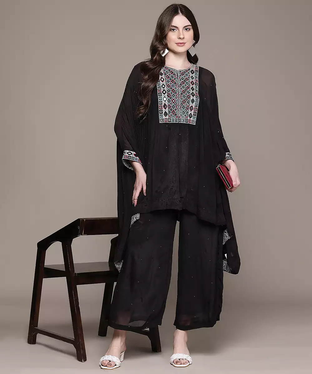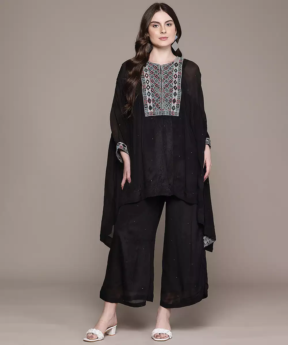 This Black Embroidered Viscose Kurta Set Exudes Elegance With Intricate Detailing On A Soft Fabric Base. The Smooth Texture Ensures Comfort, While The Rich Color Enhances Its Sophisticated Appeal. Ideal For Festive And Evening Wear, It Delivers A Timeless And Graceful Ethnic Look.