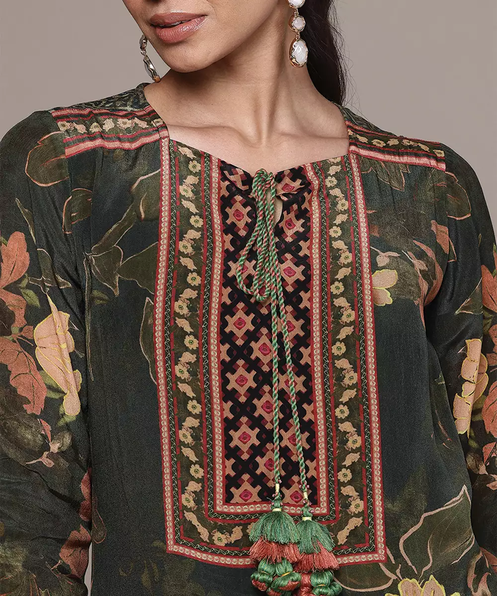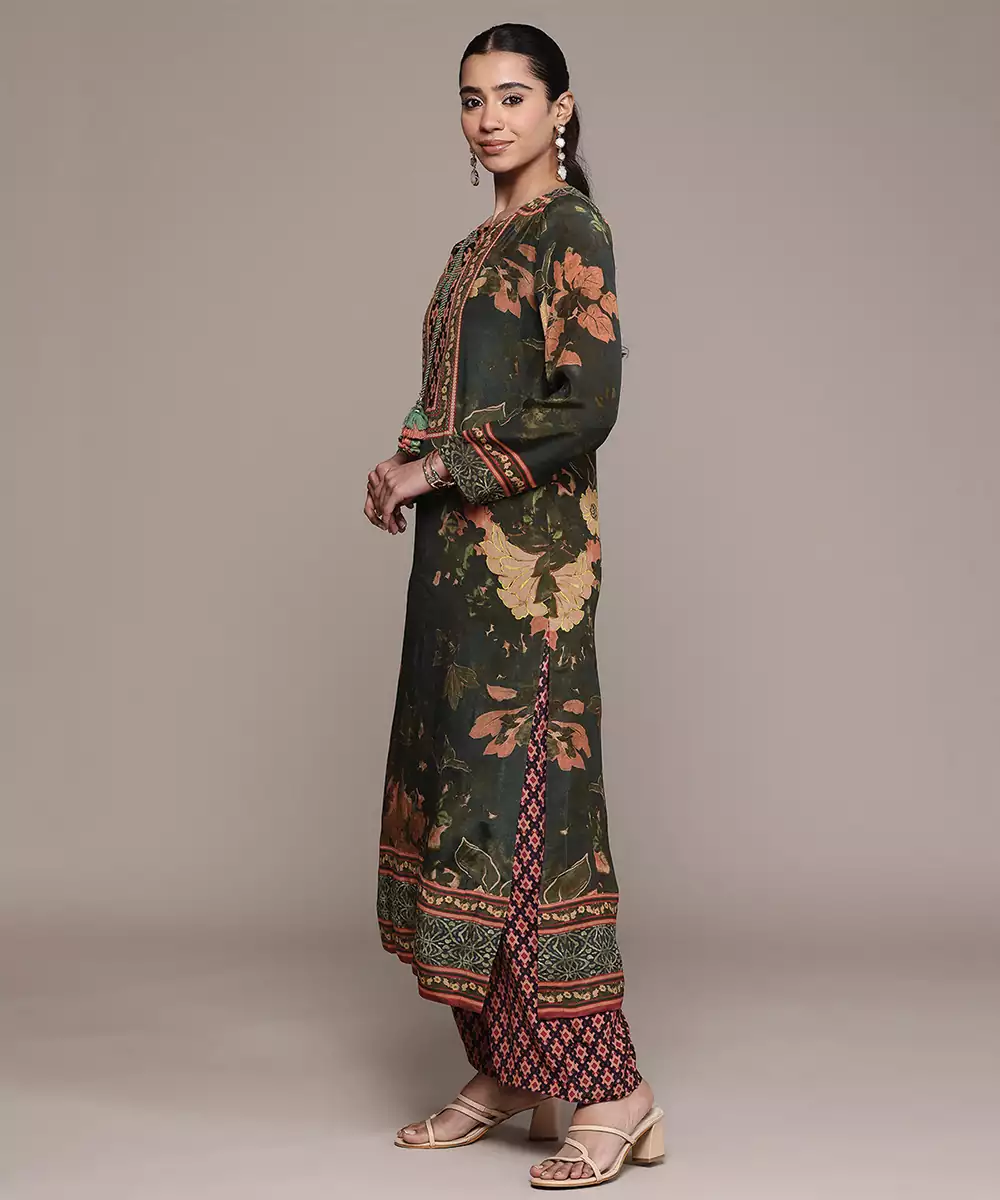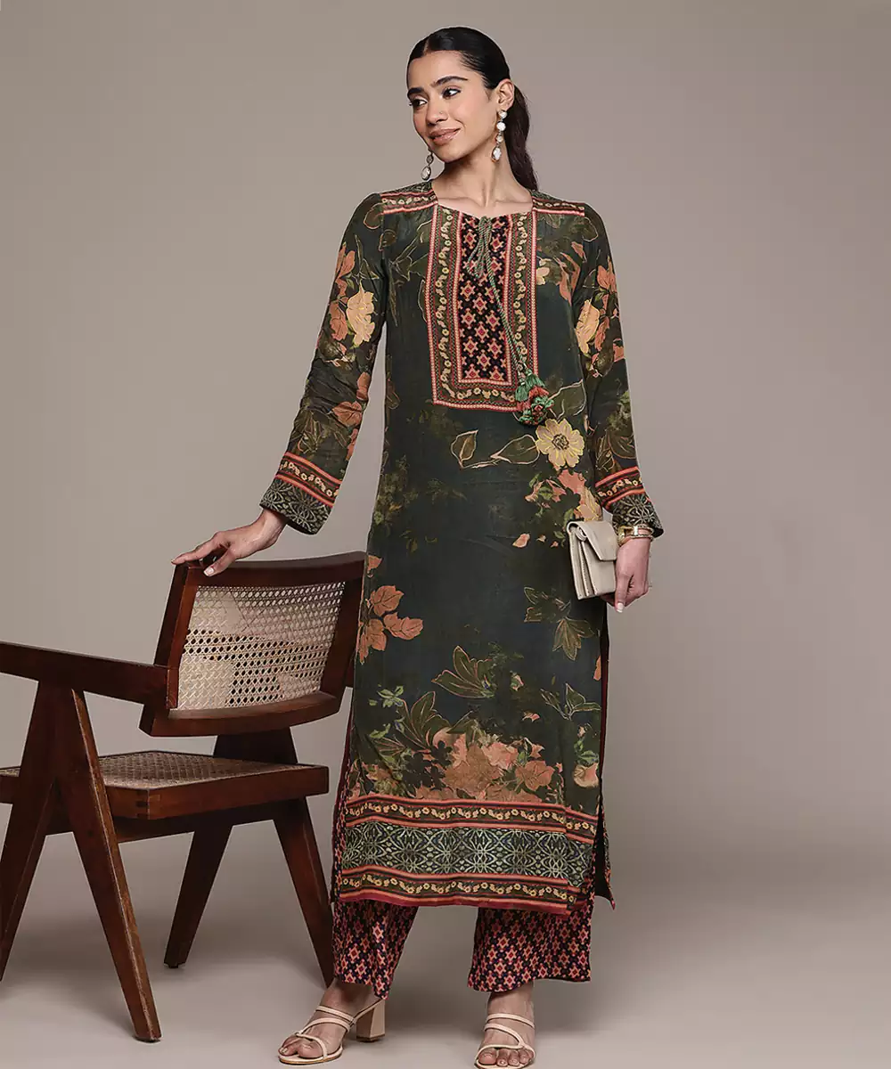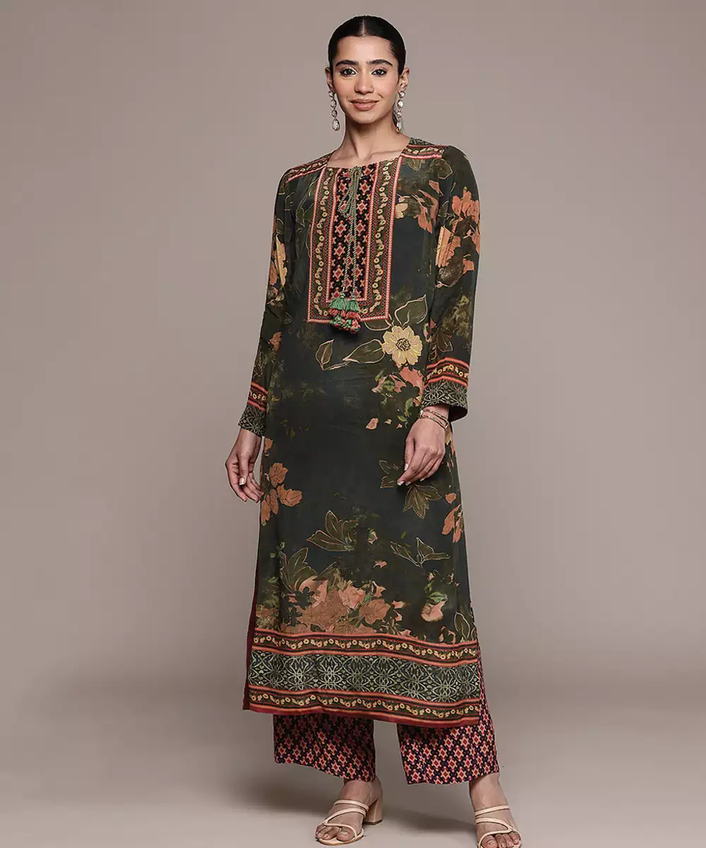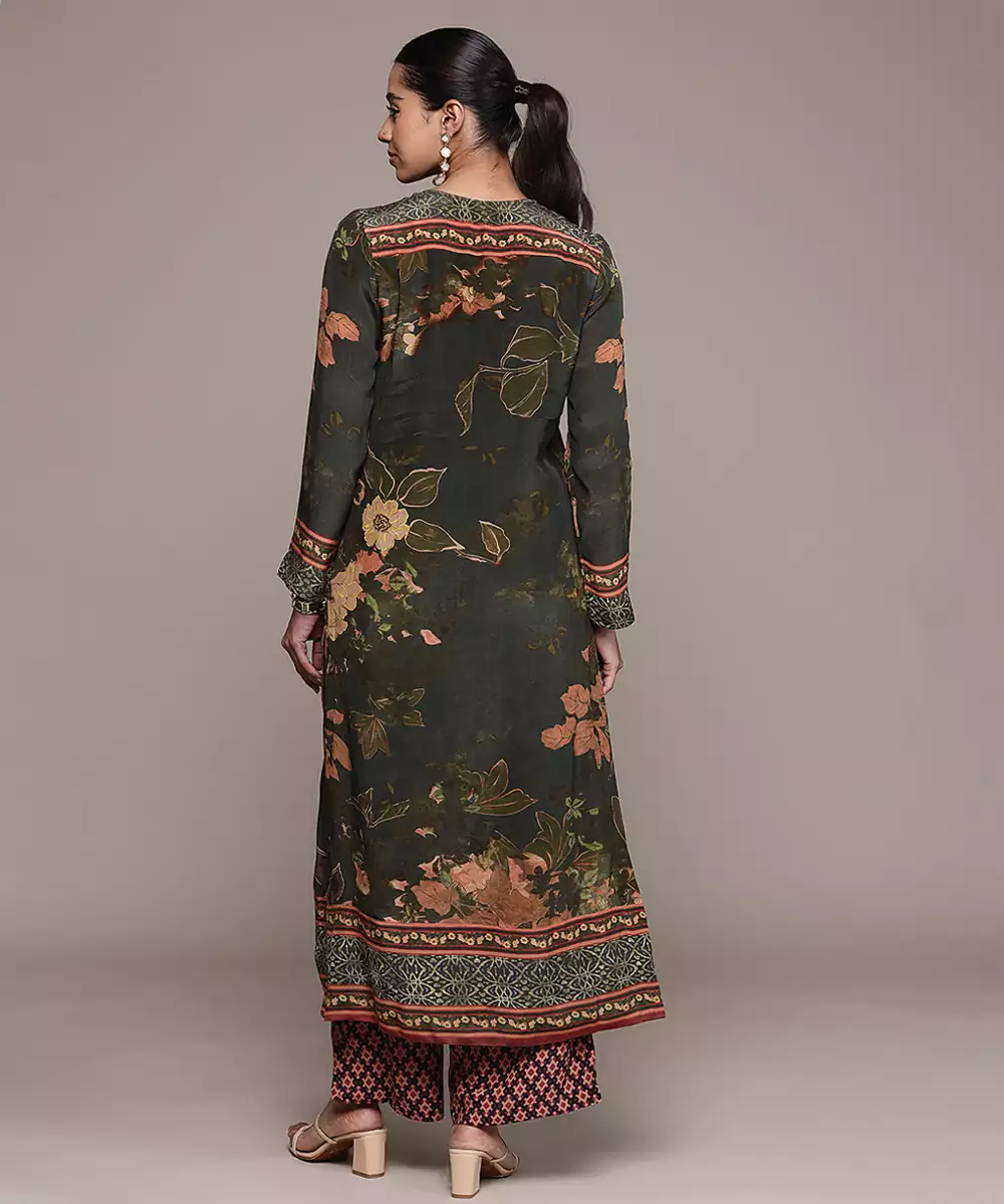 This Black Printed Crepe Kurta Set Combines A Sleek Color With Subtle Patterns For A Modern Appeal. The Lightweight Fabric Ensures Comfort, While The Elegant Silhouette Makes It Suitable For Daily Wear And Casual Outings. A Versatile And Stylish Addition To Your Wardrobe.