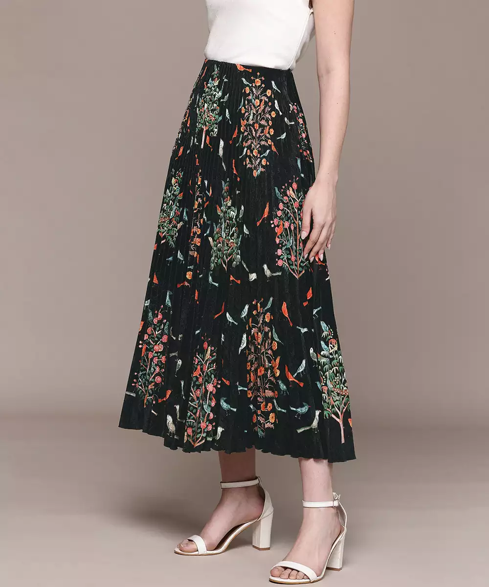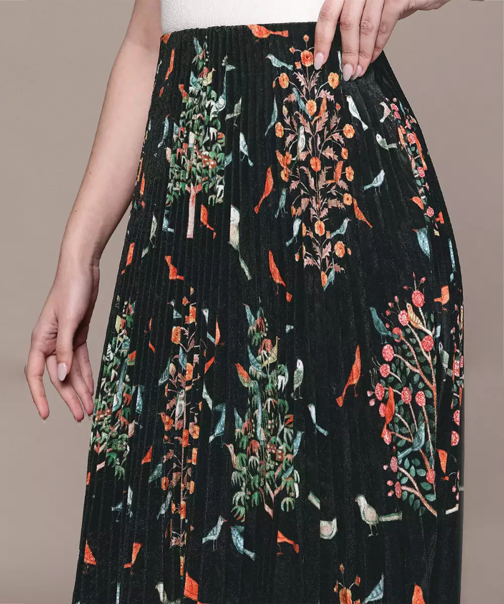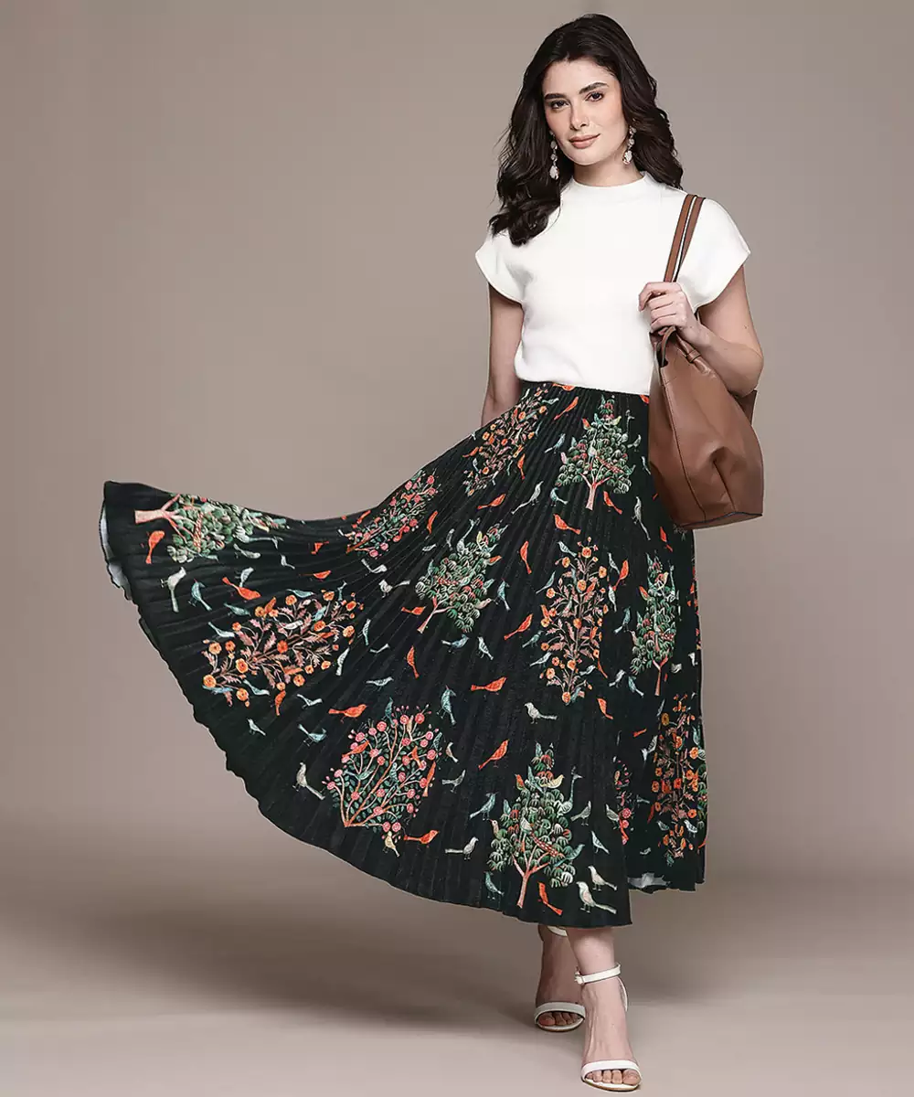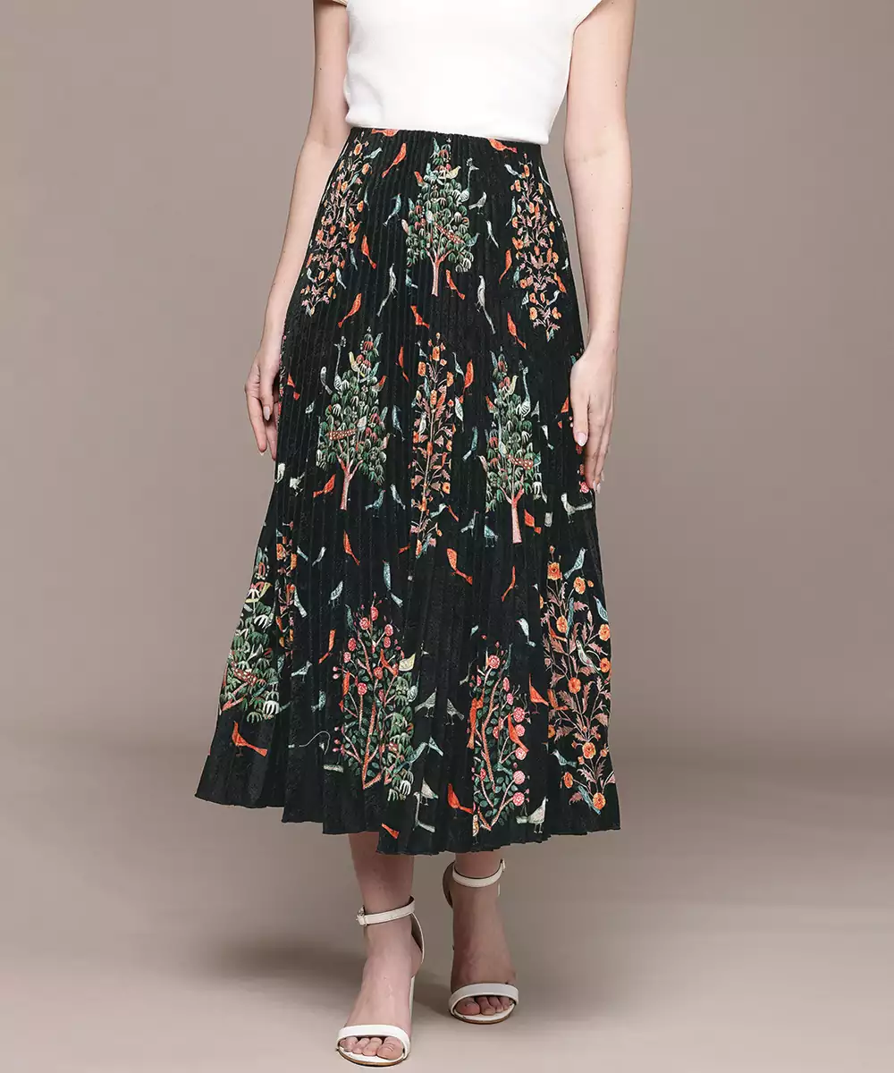 This Black Printed Viscose Skirt Combines Classic Color With Subtle Patterns For A Refined Look. The Lightweight Fabric Offers Comfort, While The Flattering Silhouette Enhances Its Appeal. Perfect For Casual And Semi Formal Styling, It Pairs Beautifully With A Variety Of Tops For A Chic And Effortless Outfit.