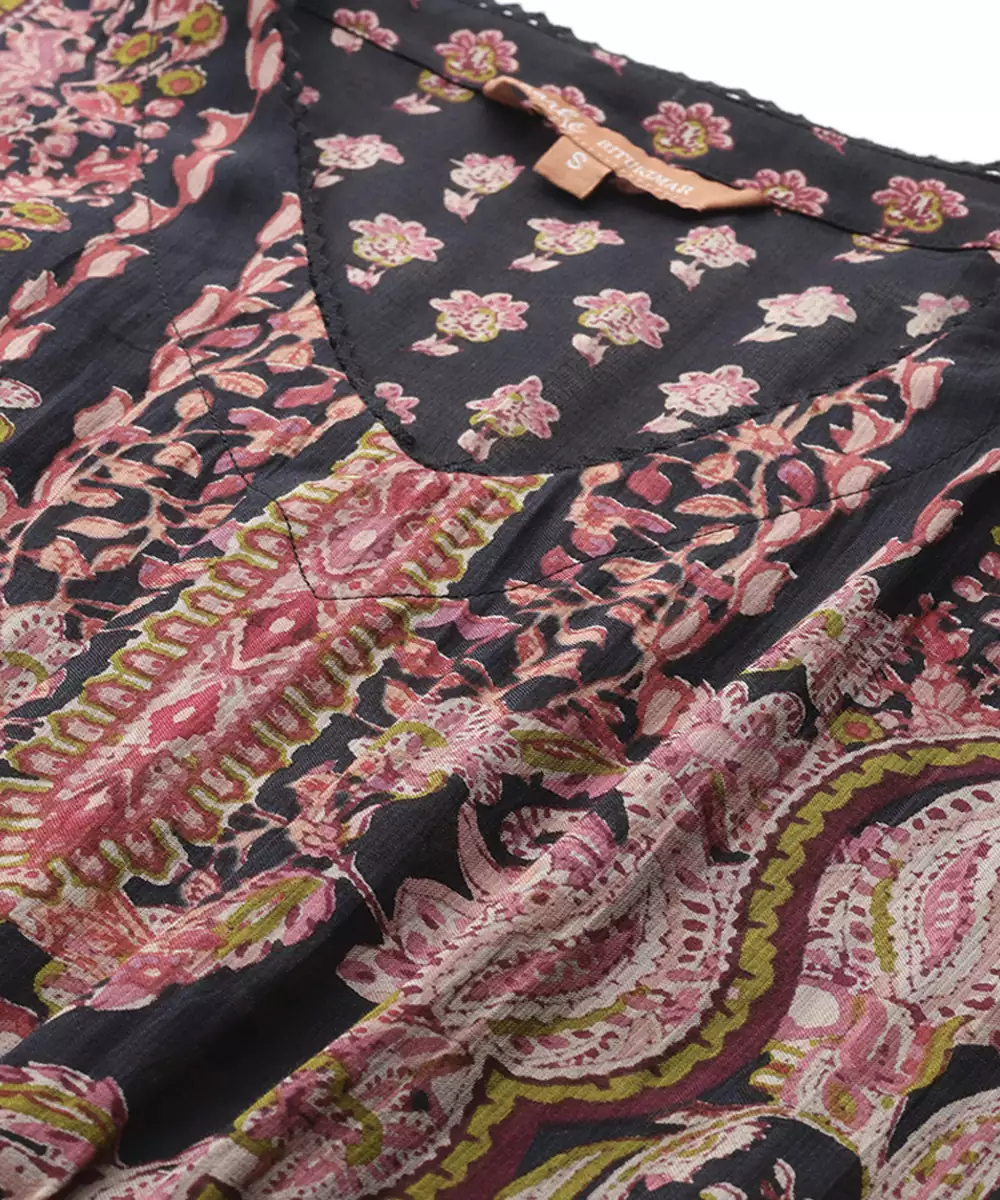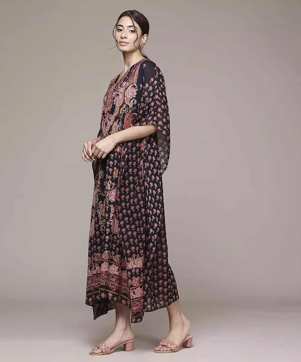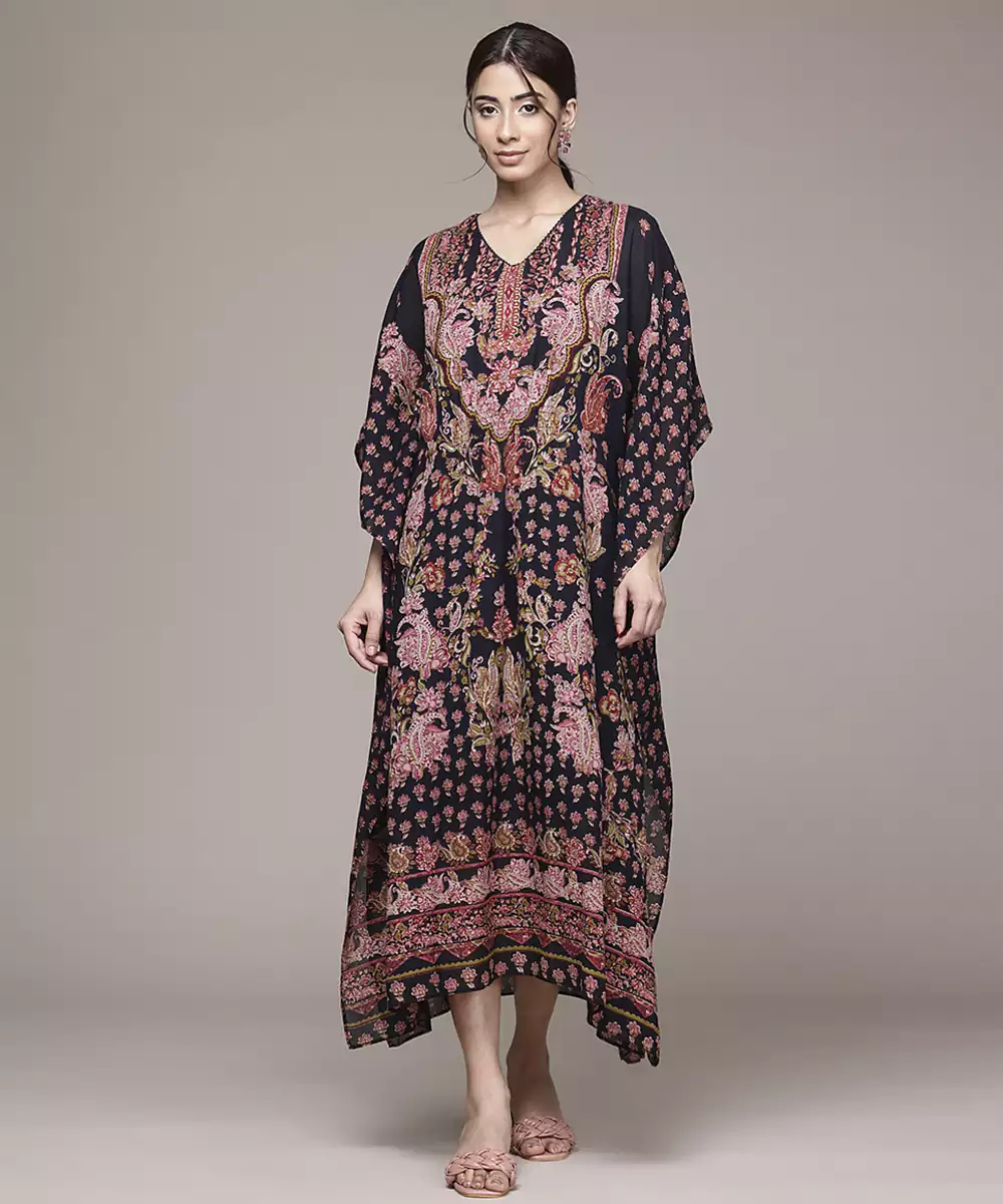 This Black Viscose Kaftan Features Printed Work Across A Soft And Breathable Fabric. The Viscose Material Offers A Smooth Drape And Comfortable Fit Suitable For Casual Wear And Festive Occasions. Full Sleeves Provide Balanced Coverage And A Relaxed Silhouette. The Printed Design Adds Visual Detail While Maintaining A Clean And Structured Appearance. The Stitched Construction Ensures A Ready To Wear Form. The Black Color Supports Versatile Styling With Different Bottoms. This Kaftan Combines Lightweight Fabric With Consistent Printed Detailing For Everyday And Occasional Use.