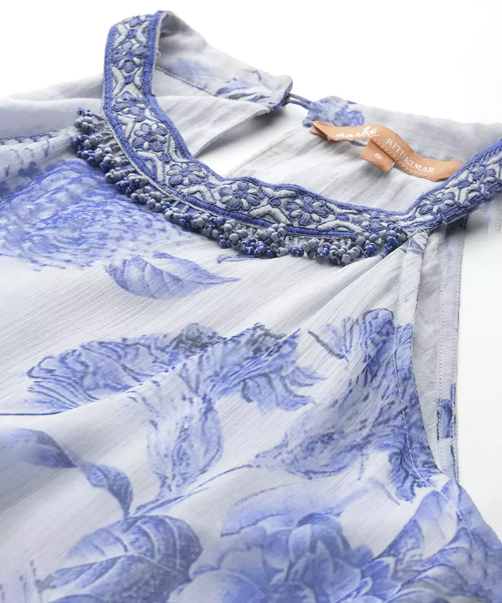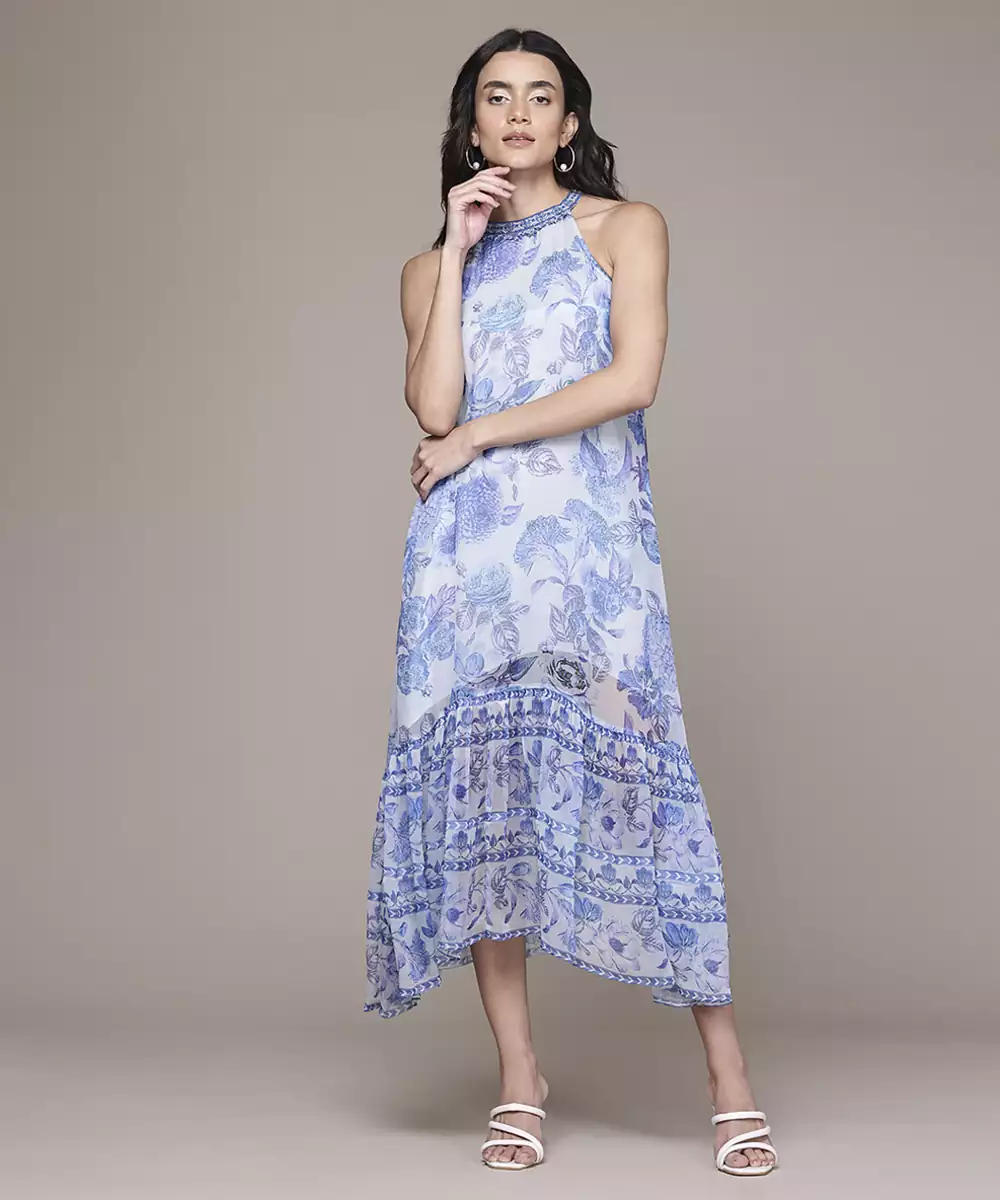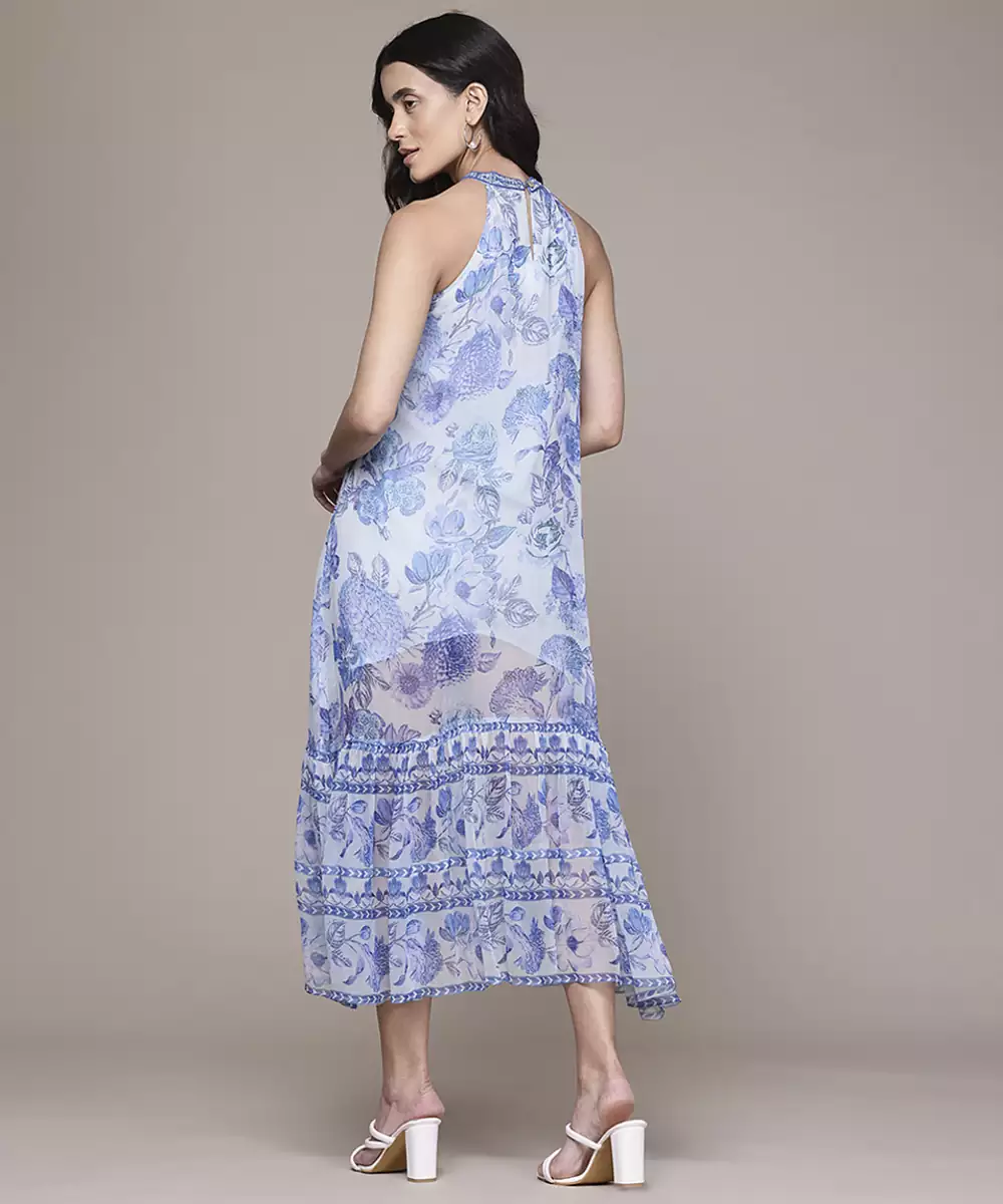 Designed With A Subtle Printed Style, This Blue Chiffon Dress Features A Sleeveless Design And Smooth Flow. The Fabric Feels Light On The Skin And Allows Easy Movement. Best Suited For Evening Occasions, Festive Events, And Social Gatherings.