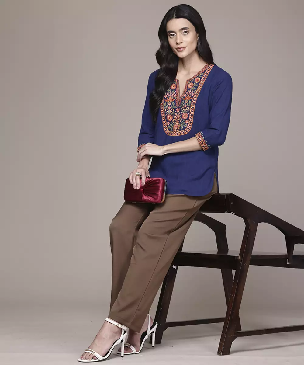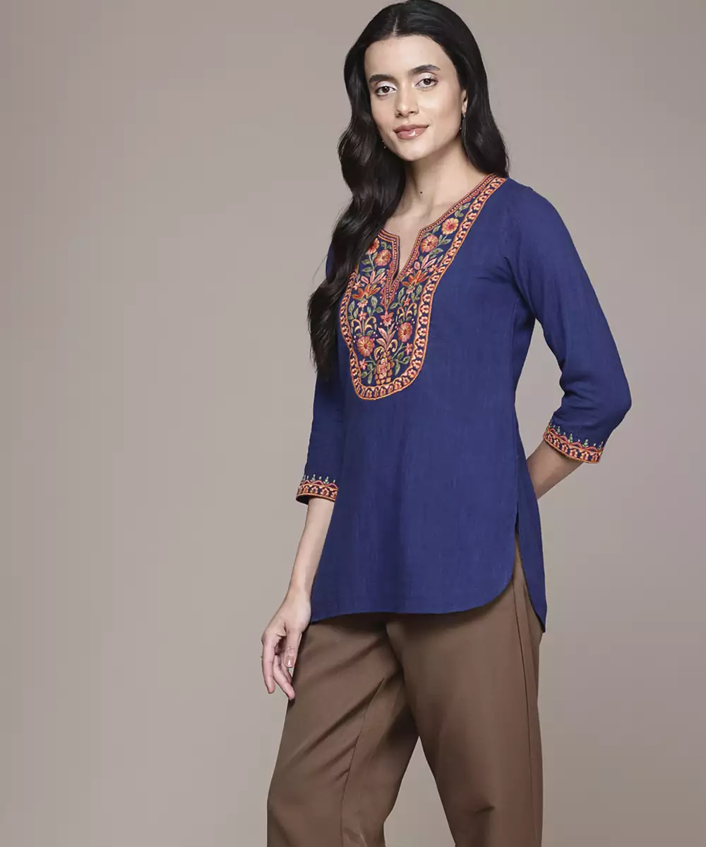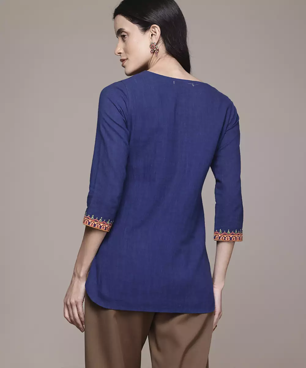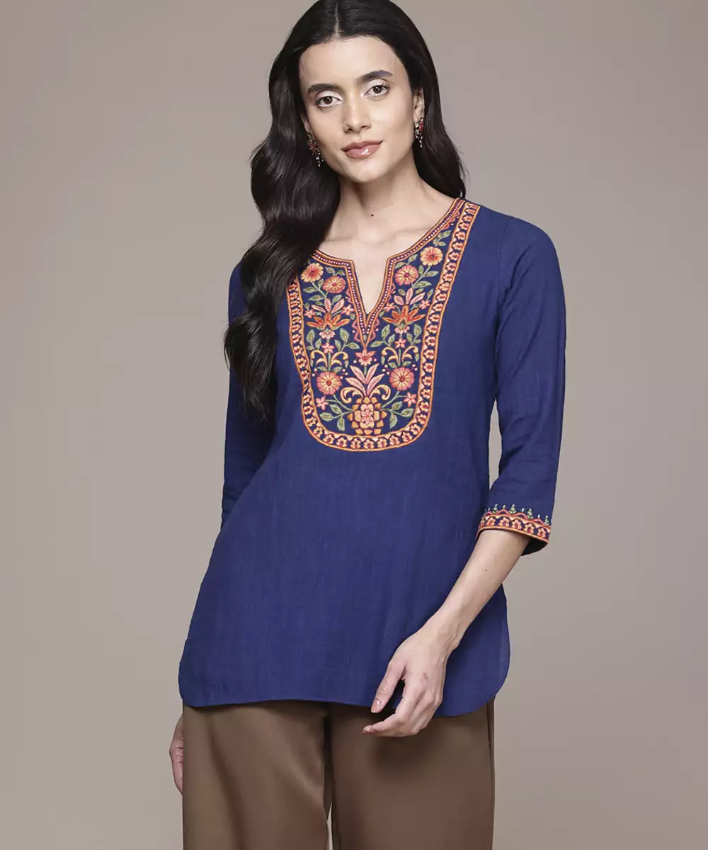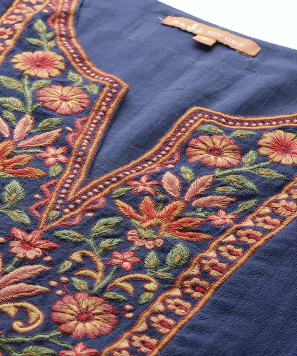 This Blue Cotton Kurta Features Embroidered Work Designed With Attention To Detail. The Breathable Cotton Fabric Supports Comfort During Extended Wear, Making It Suitable For Daily Use And Semi Formal Occasions. The Embroidery Adds Texture And A Structured Visual Element To The Overall Design. Quarter Sleeves Provide Ease Of Movement While Maintaining A Balanced Look. The Stitched Construction Ensures A Ready To Wear Fit. This Kurta Pairs Well With Various Bottom Styles, Offering Flexibility In Styling While Maintaining A Consistent Traditional Appearance.