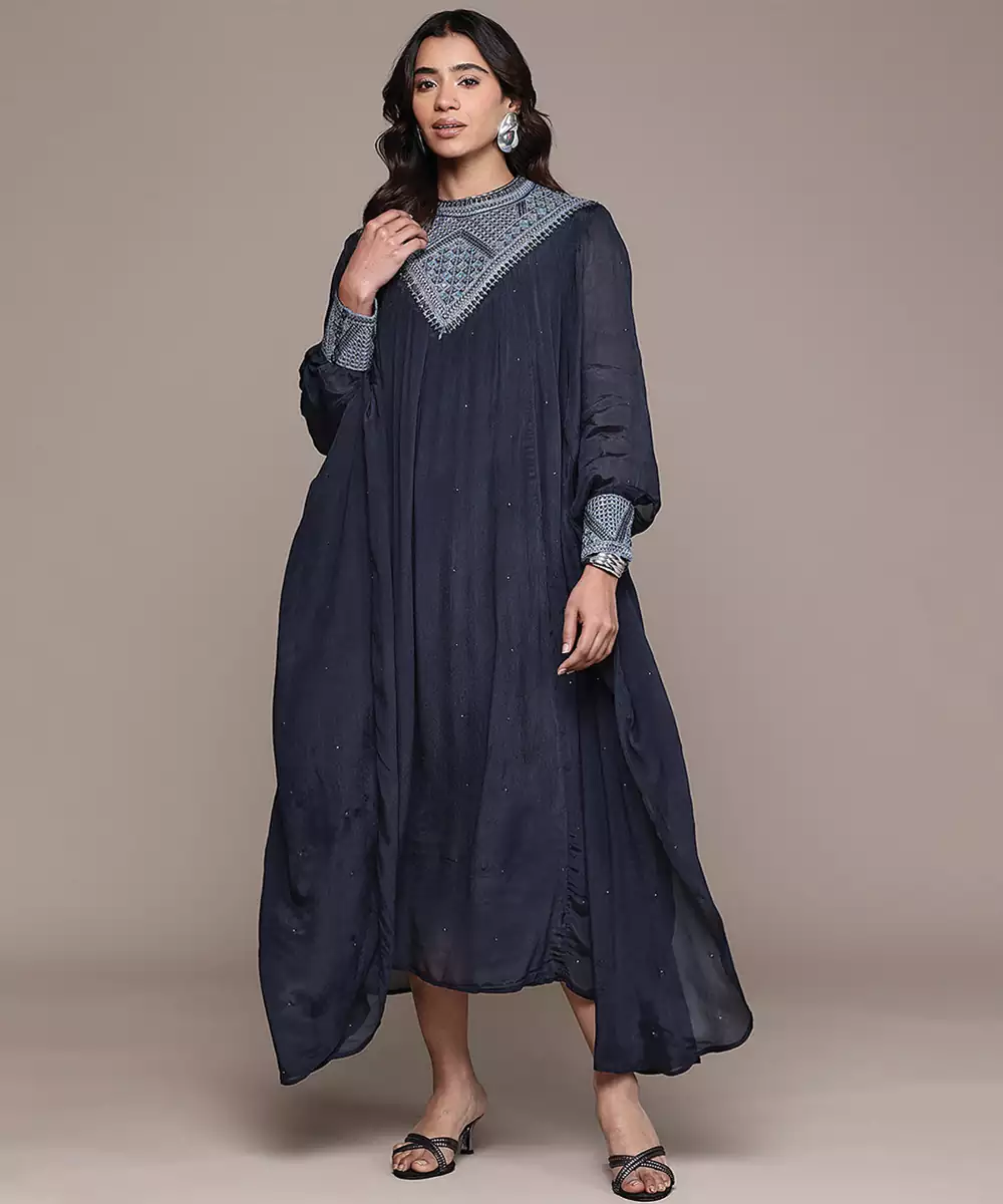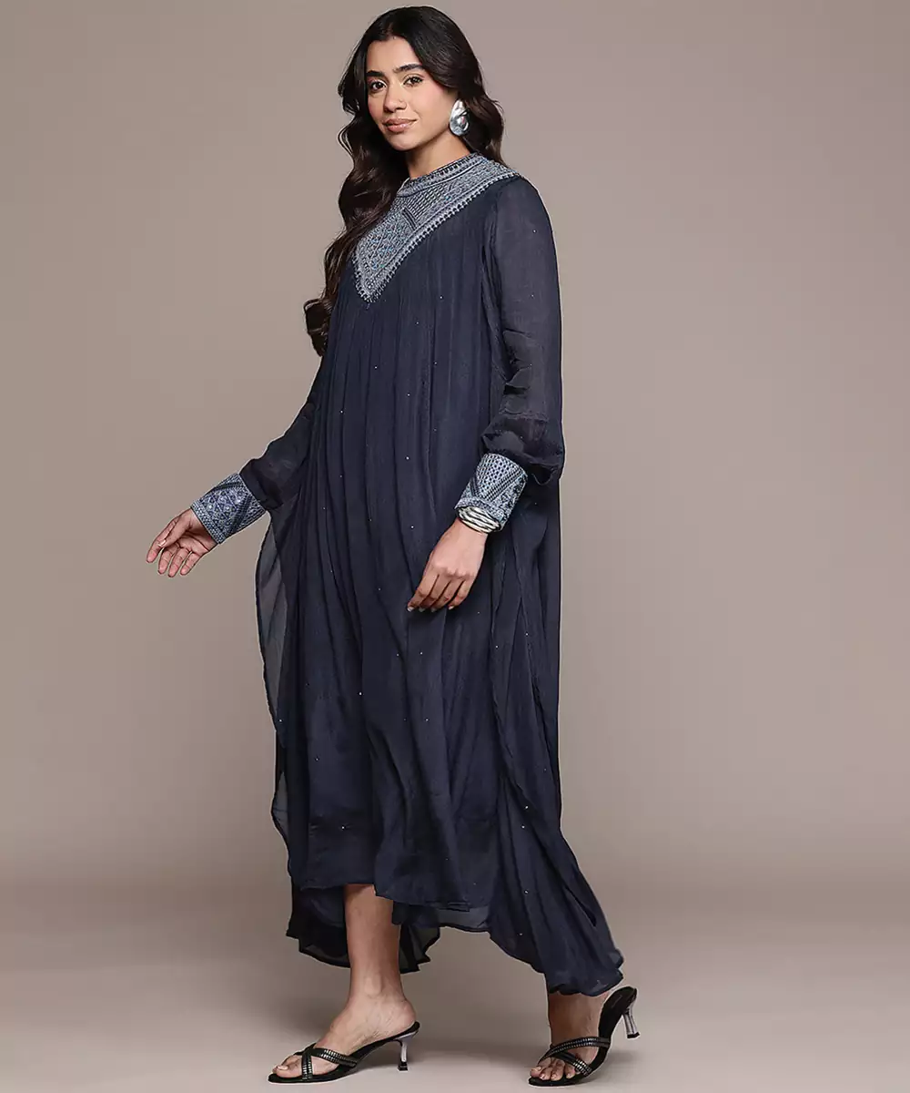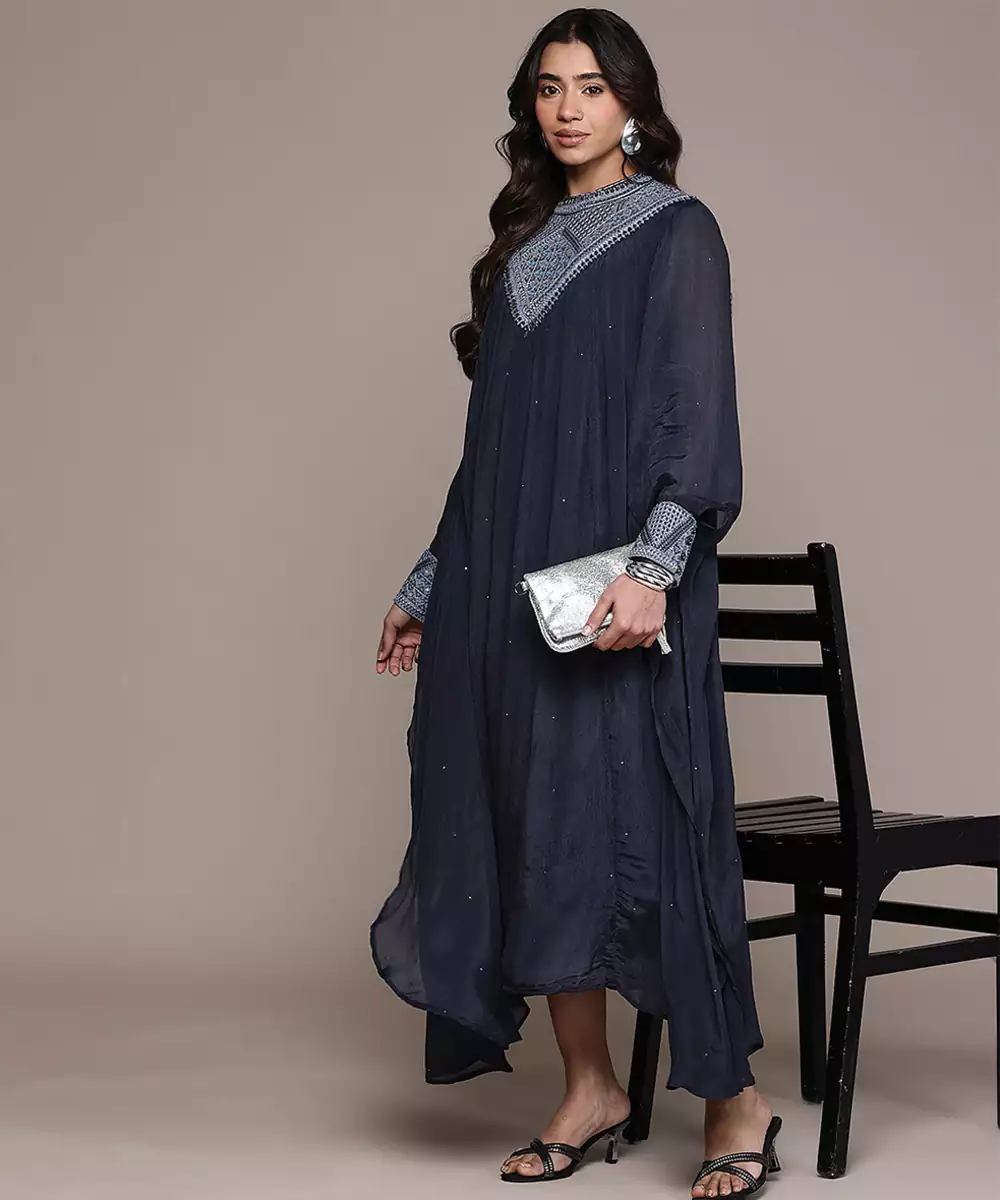 Elegant And Refined, This Blue Embroidered Chinon Dress Features Delicate Detailing On A Soft, Flowy Fabric. The Graceful Silhouette Enhances Its Charm, Making It Perfect For Festive Occasions. A Stylish Piece That Blends Comfort With Timeless Sophistication Beautifully.