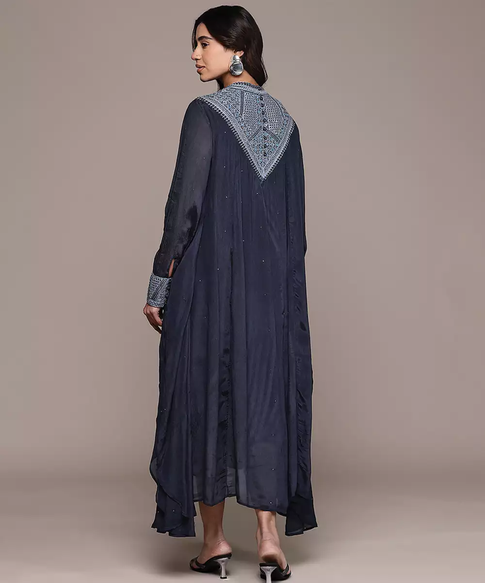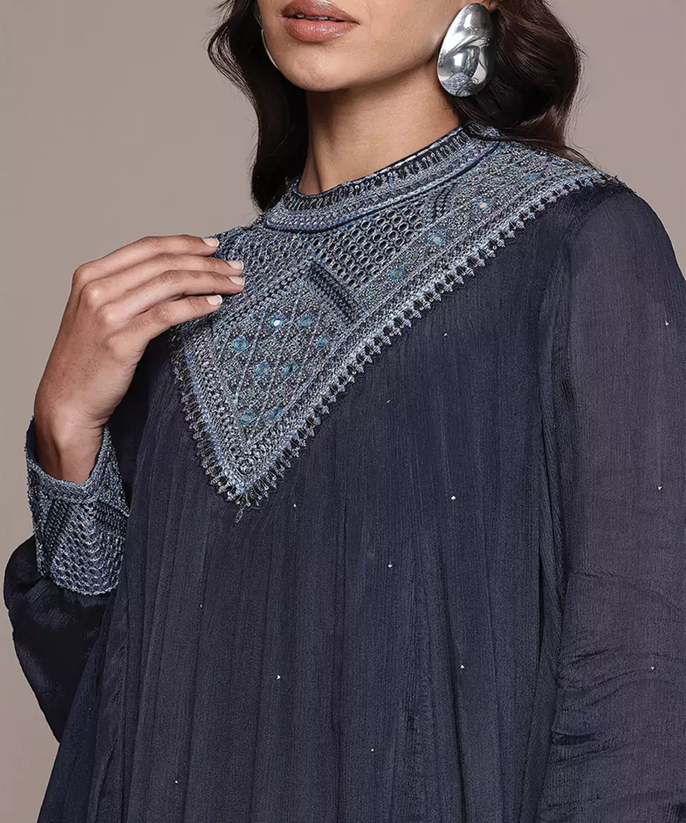 Blue Embroidered Chinon Dress